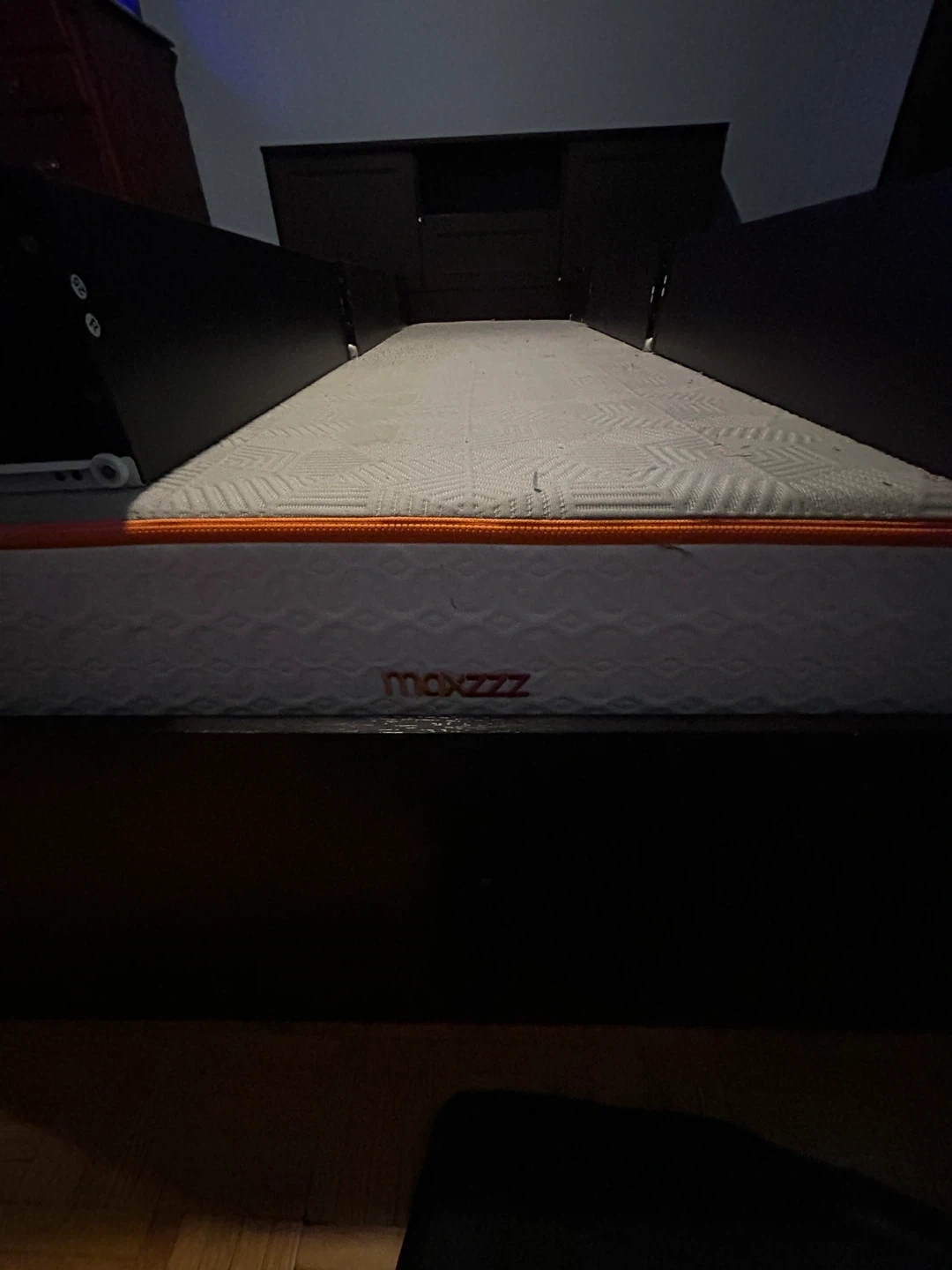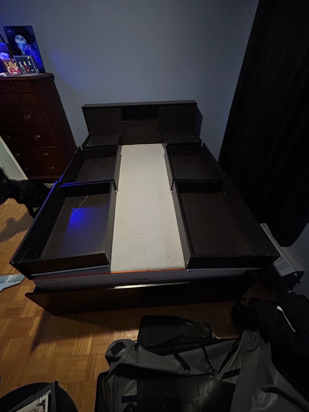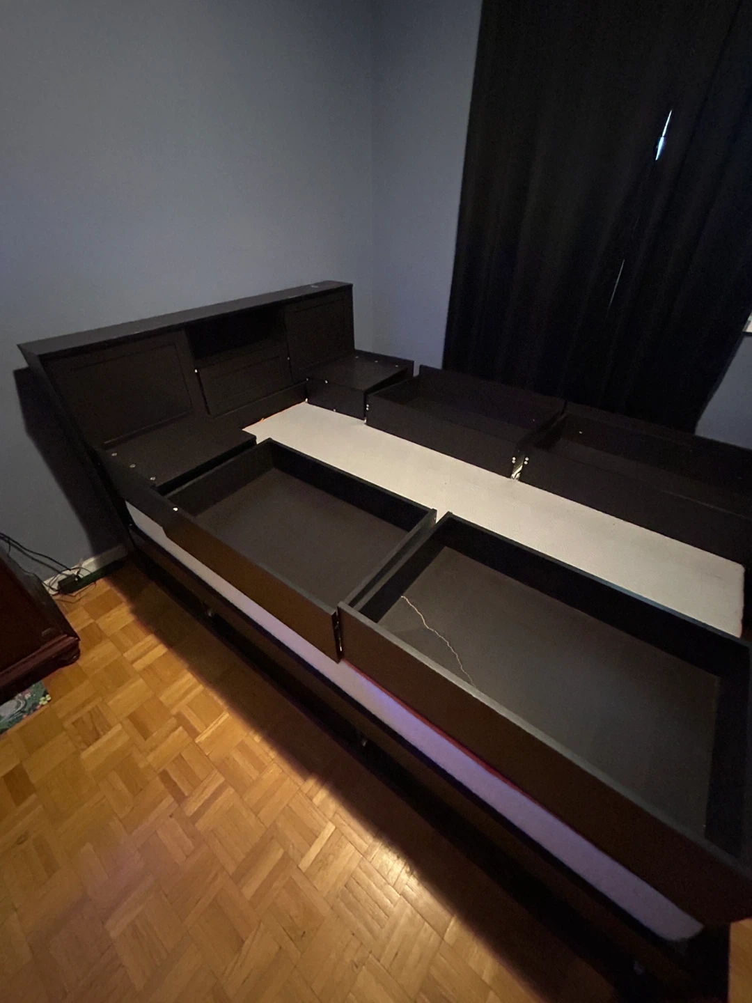 Selling a Maxzzz bed frame with built-in storage. It's a great space saver! The bed frame is in good condition and offers plenty of room to keep your belongings organized and out of sight .its a double