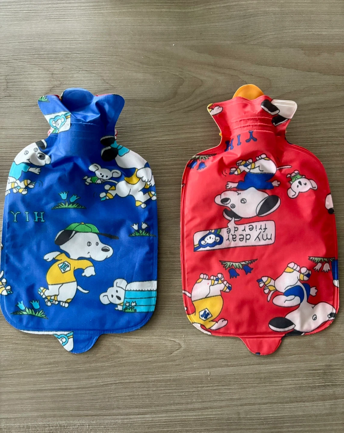 This set includes two cartoon-themed hot water bottles, one blue and one red. They're designed with playful dog characters. These bottles are great for soothing aches or keeping warm on chilly days.