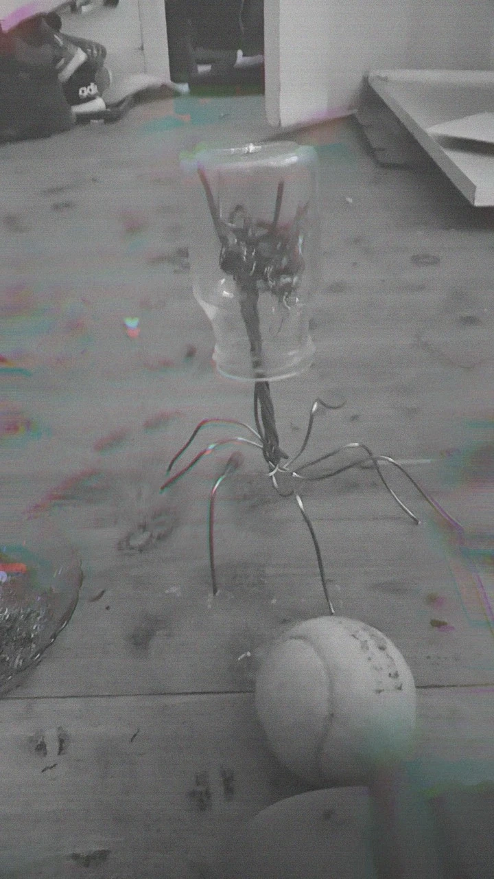 This is a wire model of a bacteriophage. It has a clear glass top and copper wire legs. A white ball serves as the base. It's a unique display piece for a desk or shelf.