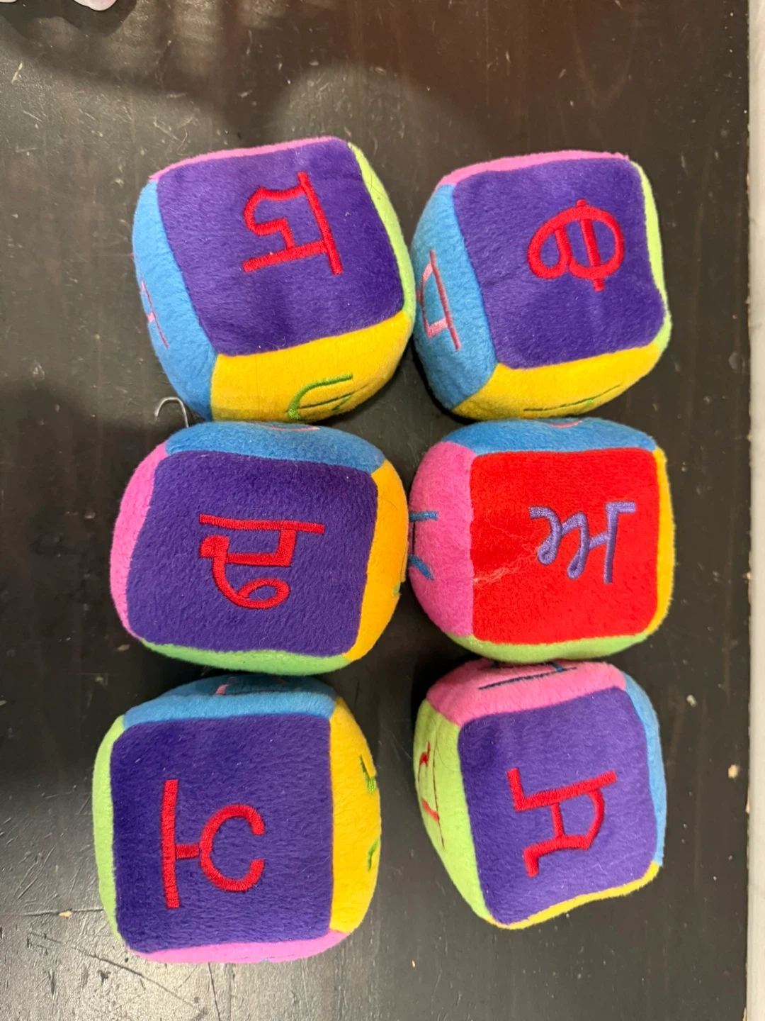 Six soft, colourful plush blocks featuring embroidered letters. Great for early learning and tactile play. Each block is a different colour combination with a distinct Punjabi letter.