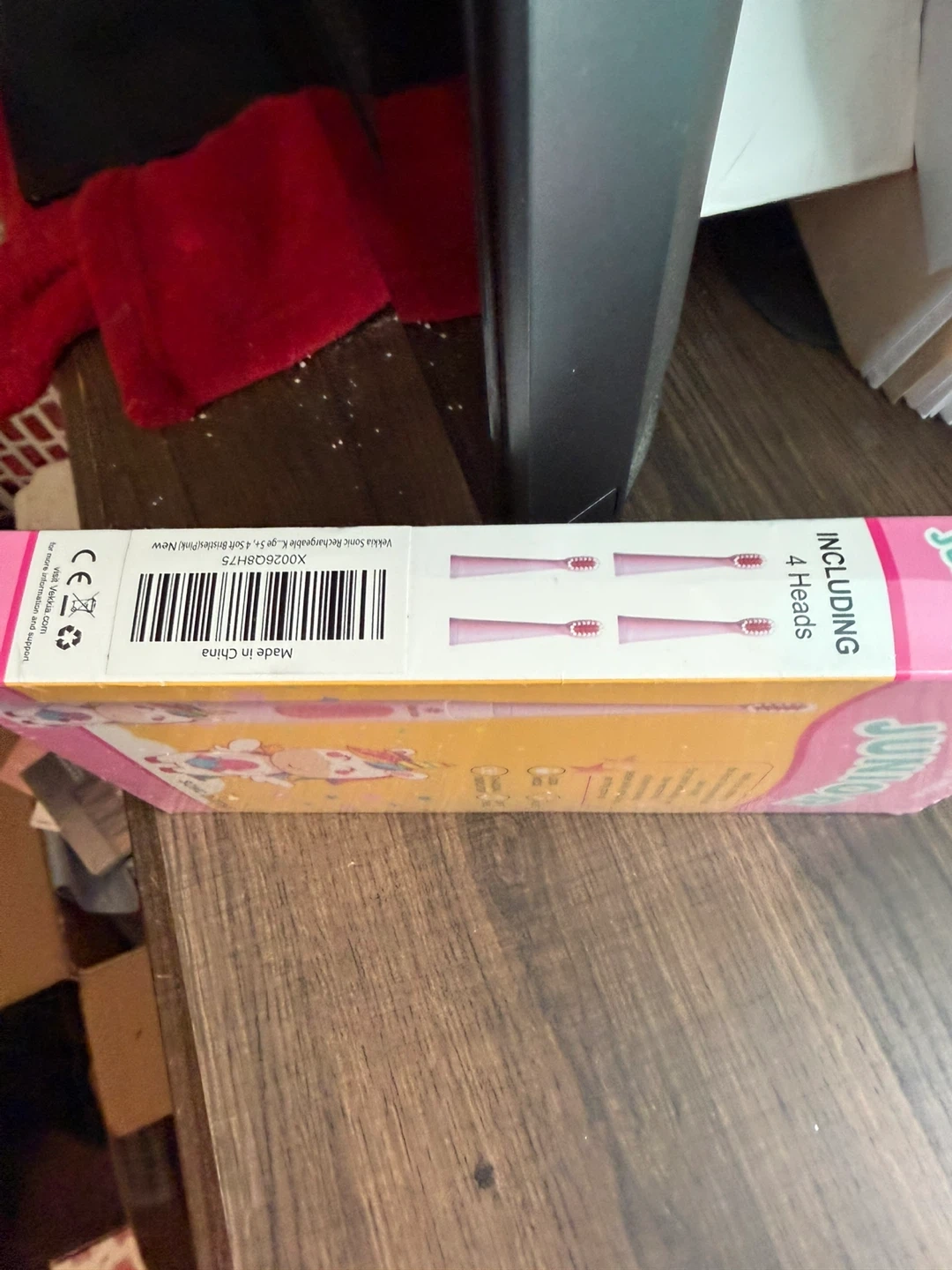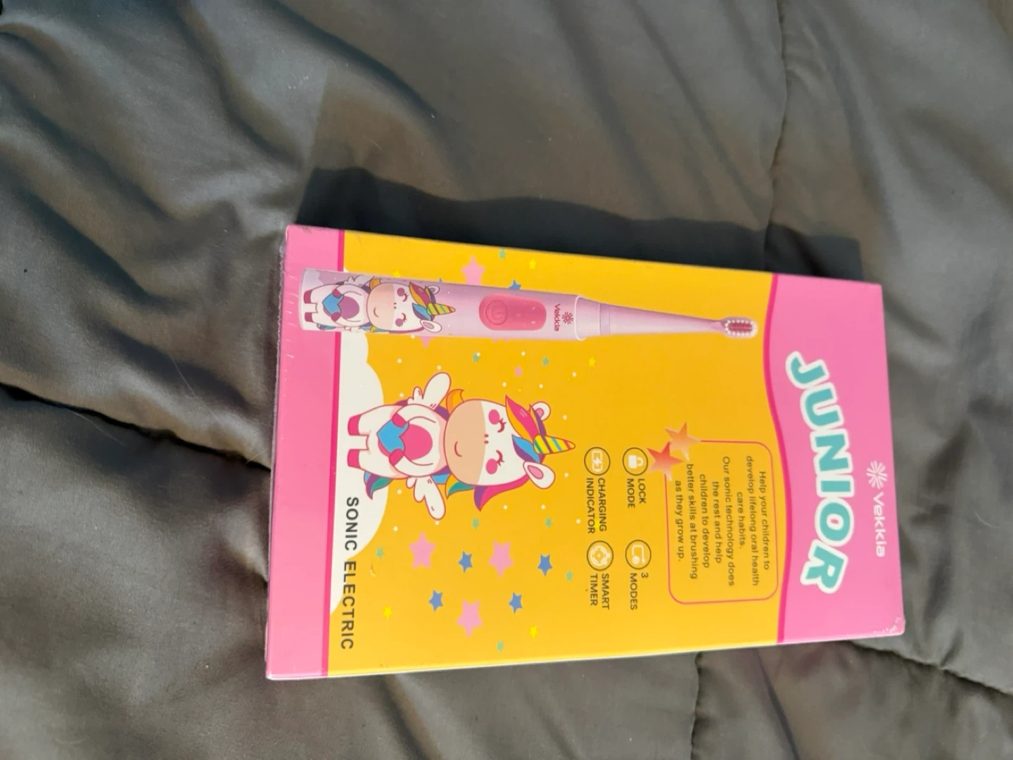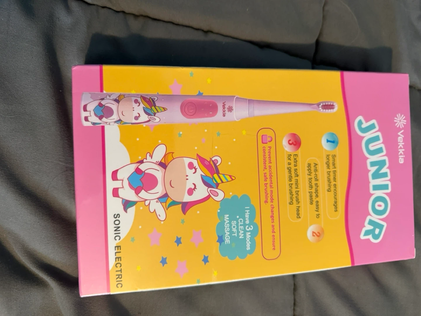 This is the Vekklia Junior Sonic Electric Toothbrush. It includes 4 replacement heads and features 3 modes with memory: Clean, Soft, and Massage. The toothbrush has a smart timer to encourage longer brushing. It's designed to help children develop better brushing habits.