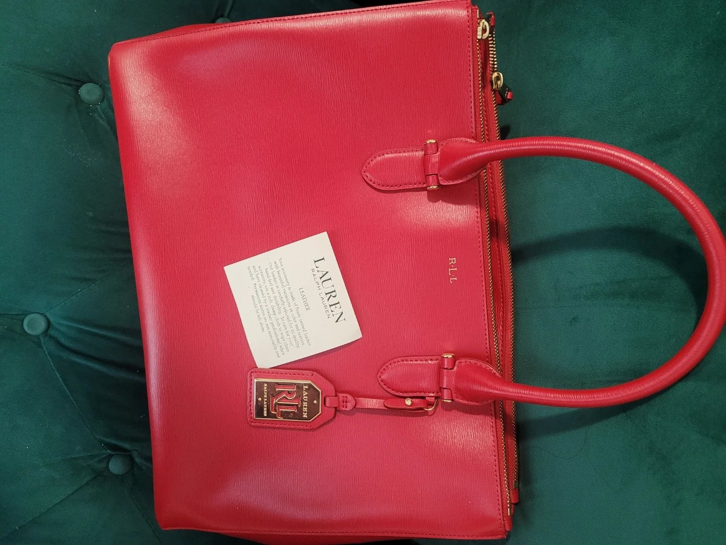 This Lauren Ralph Lauren tote is made from red leather. It features a zip closure and a convenient top-handle design. A great bag for everyday use!