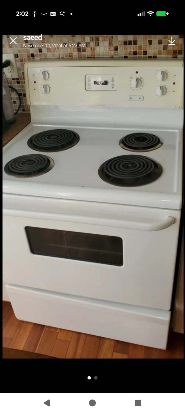 This is a white electric stove with four coil burners and an oven. It has a classic design with front control knobs. The oven window lets you check on your baking. It's a functional appliance for any kitchen.