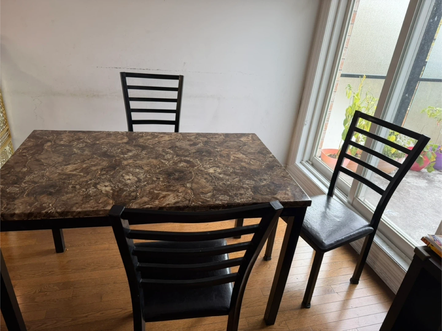 Dining table with matching chairs in great working condition. The table has a stylish dark top that’s easy to clean and scratch-resistant, paired with sturdy black metal legs. Chairs are comfortable with ladder-back design and cushioned seats. Perfect for kitchen, apartment, rental unit, or family dining area. Neutral dark tones match most interiors.