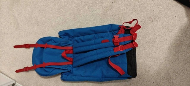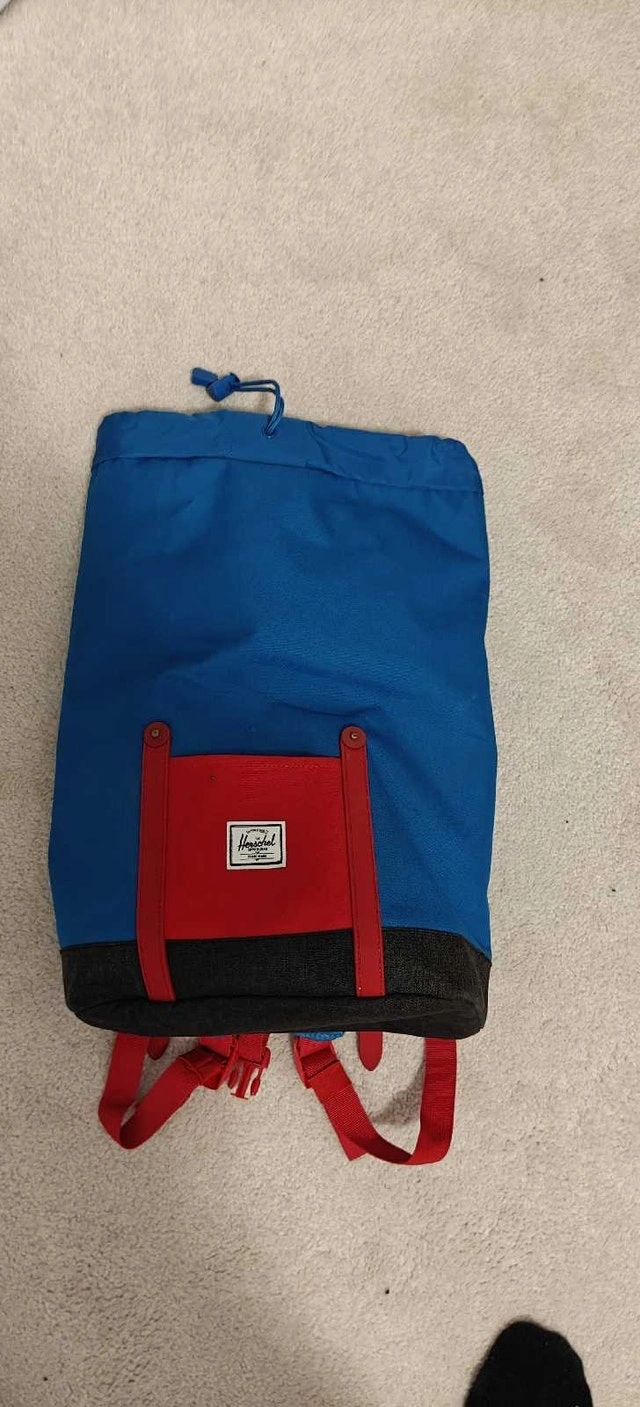 This is a new Herschel backpack, perfect for school or travel. It features a main compartment with a drawstring closure, a front pocket, and adjustable shoulder straps. It has some signs of wear and tear. If the ad is up, it's still available! Cash accepted.