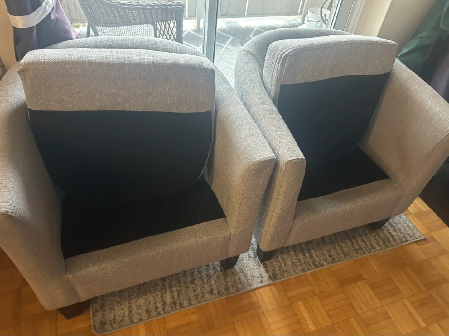 A set of two barrel-style accent chairs in a light grey textured fabric. Bought from Leon’s a year and a half ago for $180 for the pair. No longer match our decorations so the reason for selling. There a curved back and have sturdy dark wooden legs. One seat has a little mark on it (see picture) it’s from concentrated washing soap that leaked out of a bag of groceries we put on the chair, we’ll give it another clean again before purchase. We don’t have pets so no scratches or hairs and we have never smoked so it won’t smell like an ash tray!