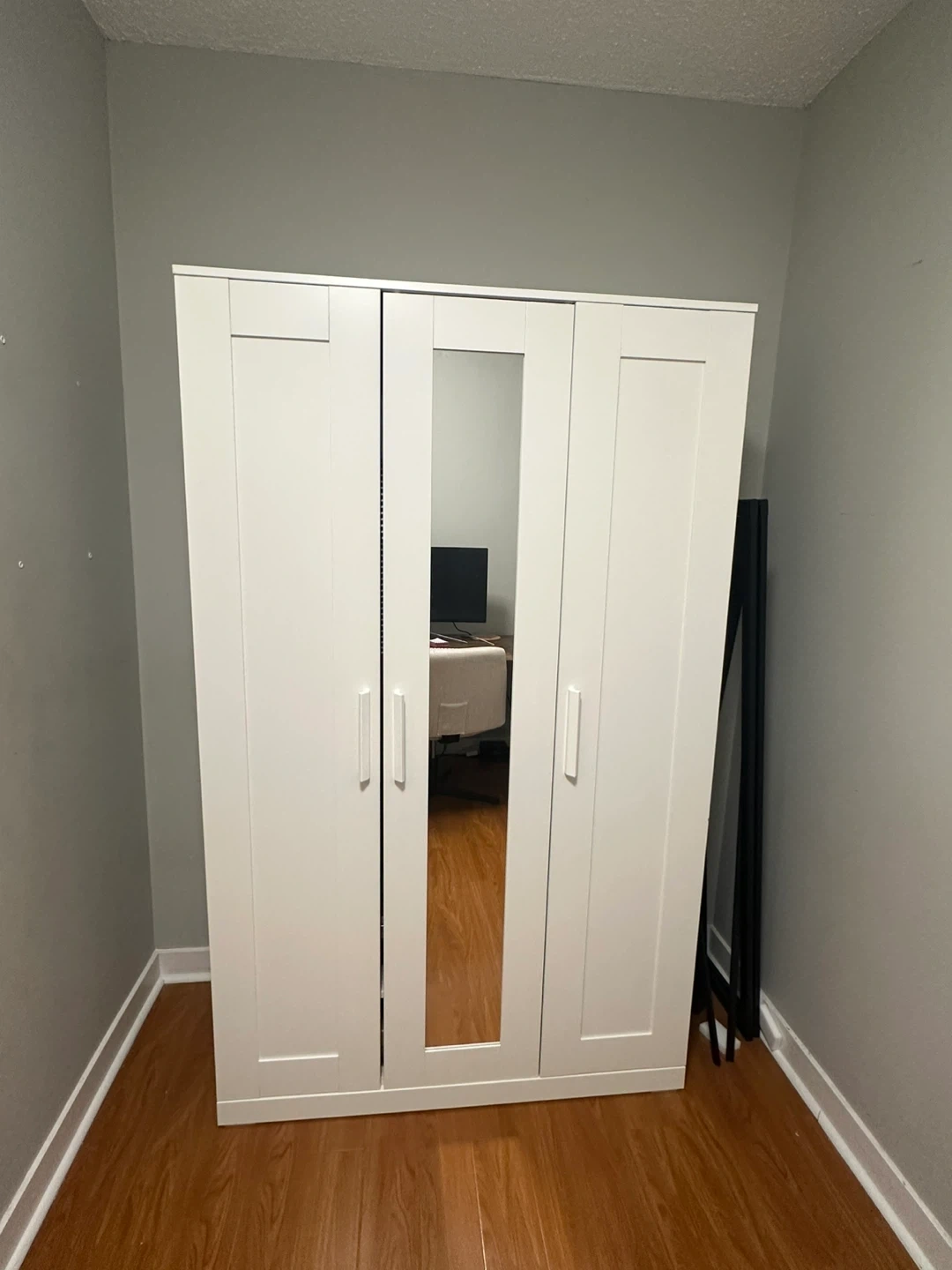 White wardrobe with three doors, two of which have mirrors. It's 117cm wide and 190cm tall. This unit provides ample hanging and shelf space for clothing storage.