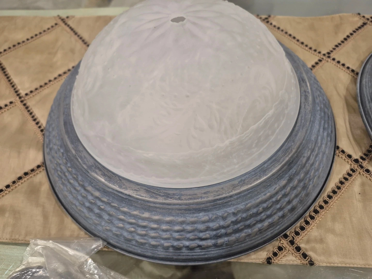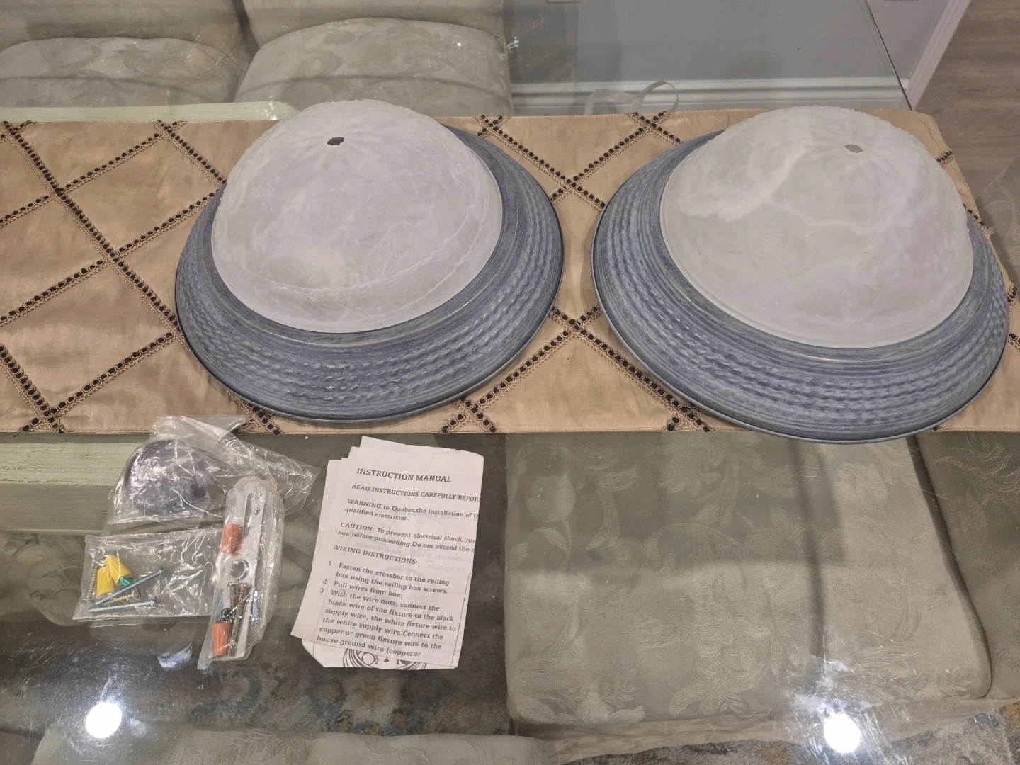 Selling a set of two ceiling light fixtures. They feature a unique design with a textured blue-grey base and a frosted glass dome. All the necessary hardware and an instruction manual are included! Misplaced the screws of one. Both for $15. Major intersection Brittania and 10th Line in Mississauga