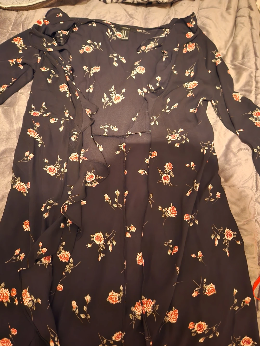 This black floral print kimono cardigan from Forever 21 features a lightweight, flowy design with ruffled edges. It's a size medium and made in China. Perfect for layering over outfits! If you interested chat with me and I'll give you the meeting spot/my address.