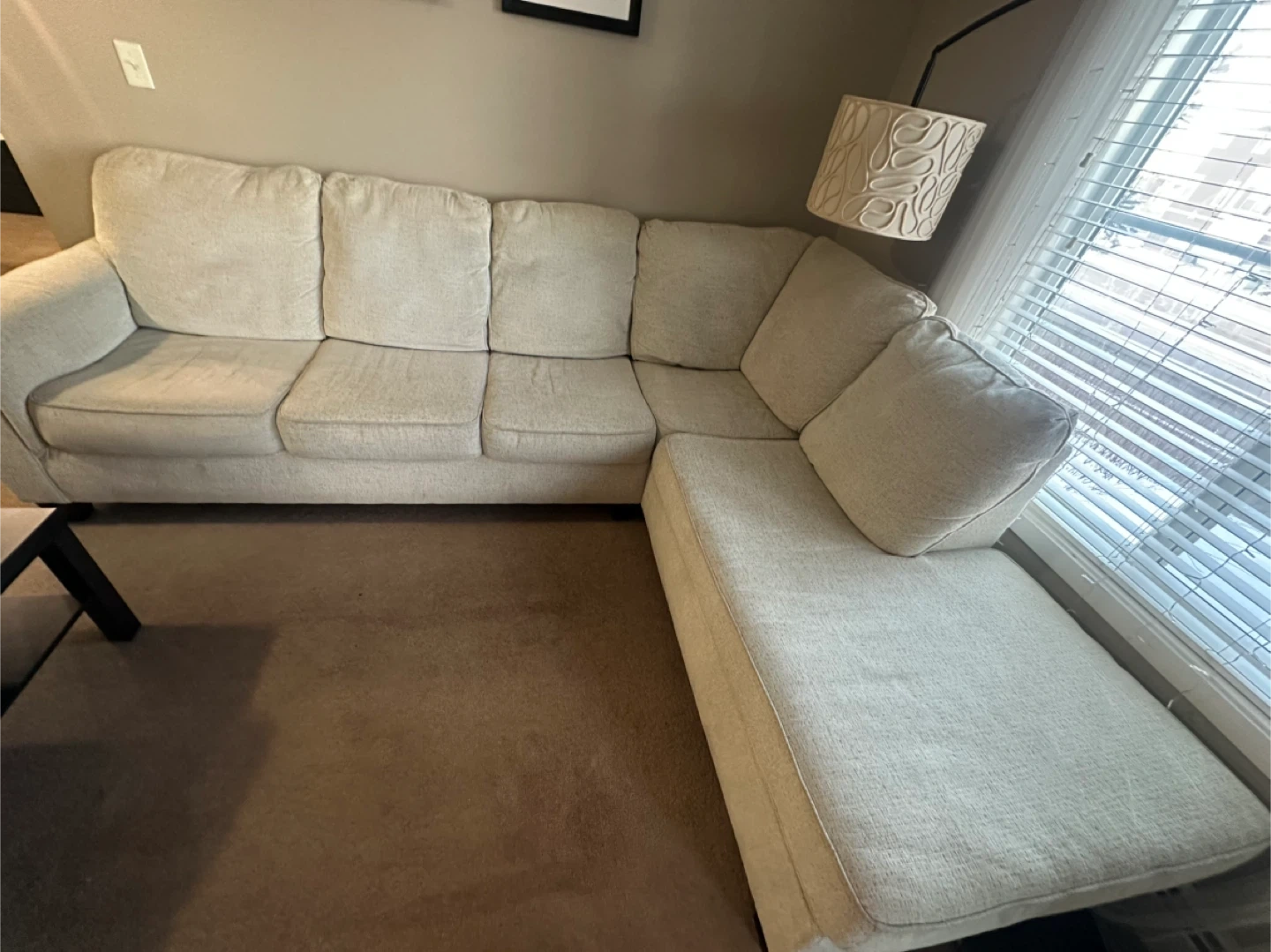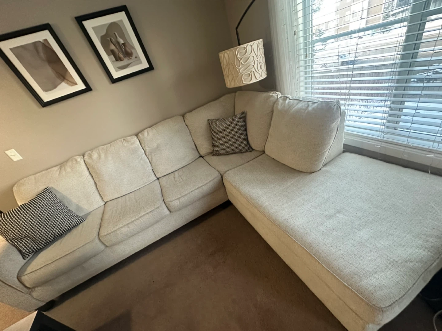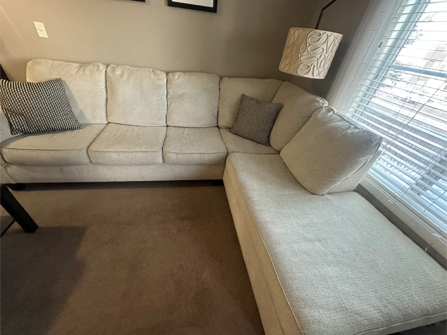Comfortable beige sectional sofa featuring a chaise lounge bought from Ashley furniture. Upholstered in a textured fabric. Includes throw pillows. Perfect for a living room or den!