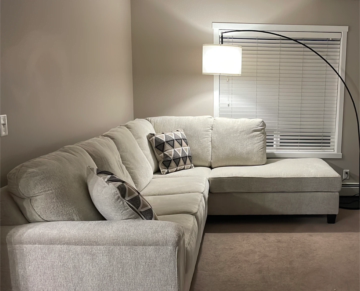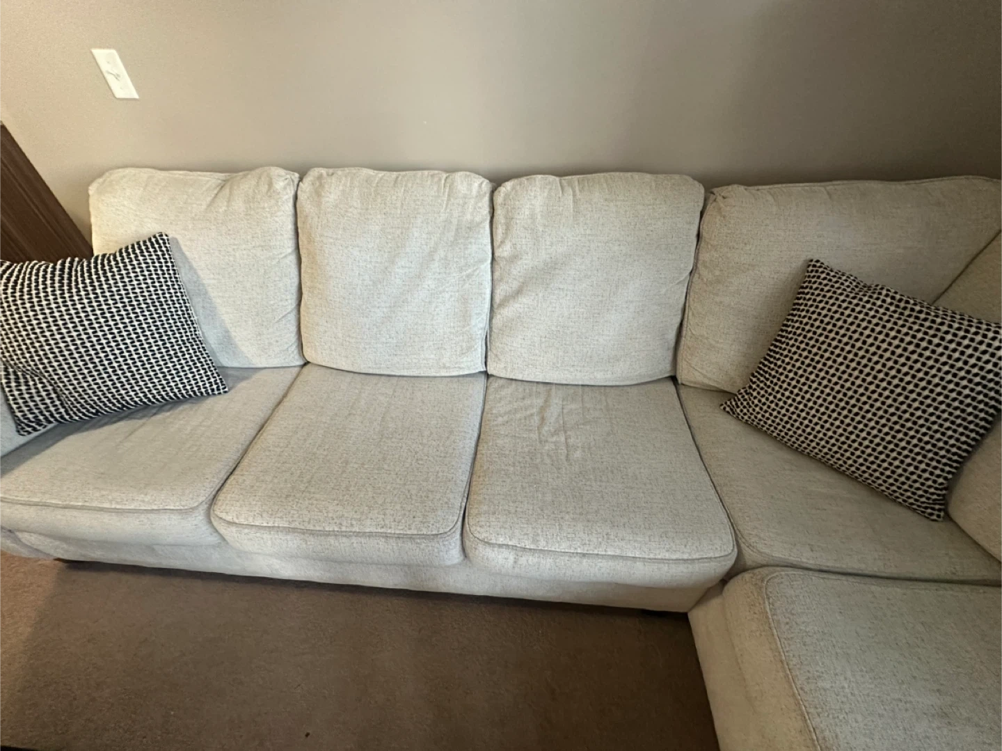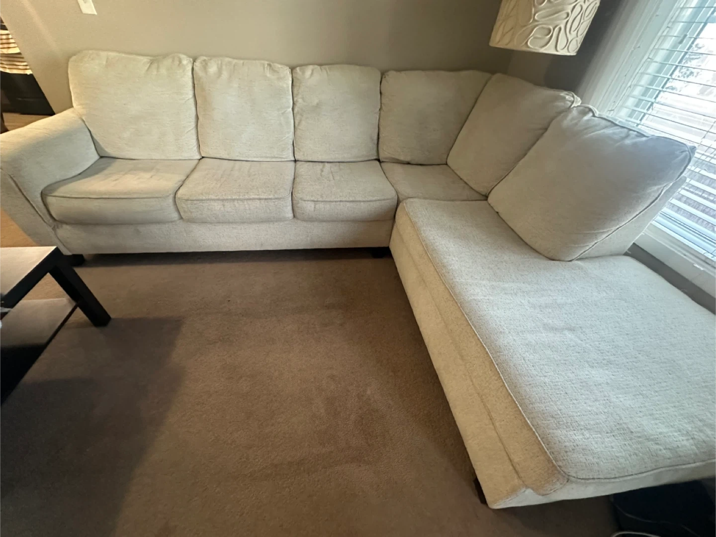 Comfortable beige sectional sofa featuring a chaise lounge bought from Ashley furniture. Upholstered in a textured fabric. Includes throw pillows. Perfect for a living room or den!