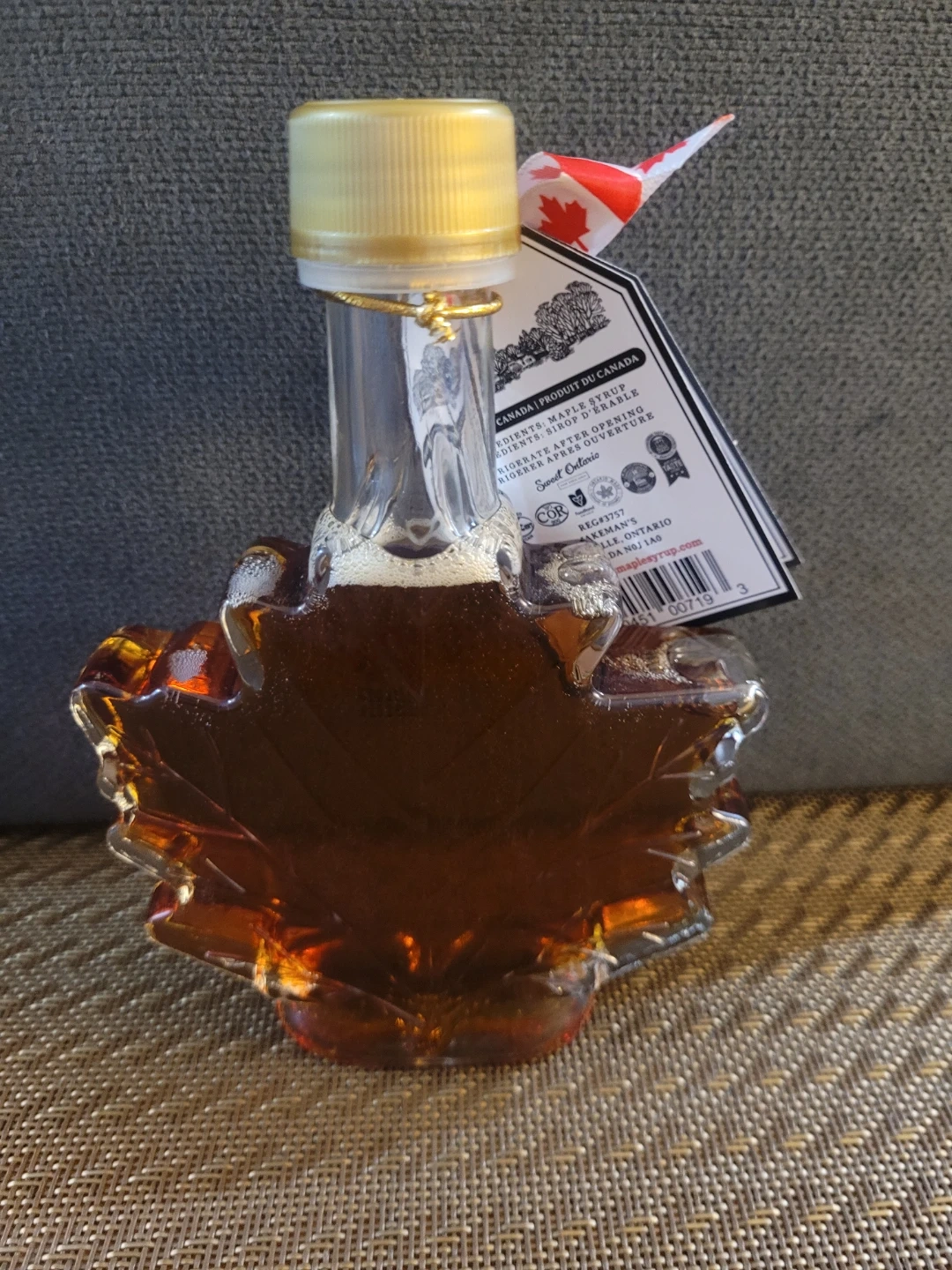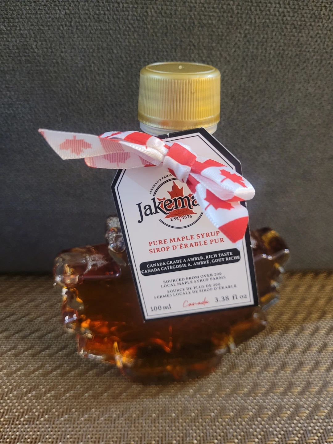 Jakeman's Pure Maple Syrup in a decorative leaf-shaped bottle. Canada Grade A Amber, rich taste. 100ml / 3.38 fl oz. Sourced from over 200 local maple syrup farms.