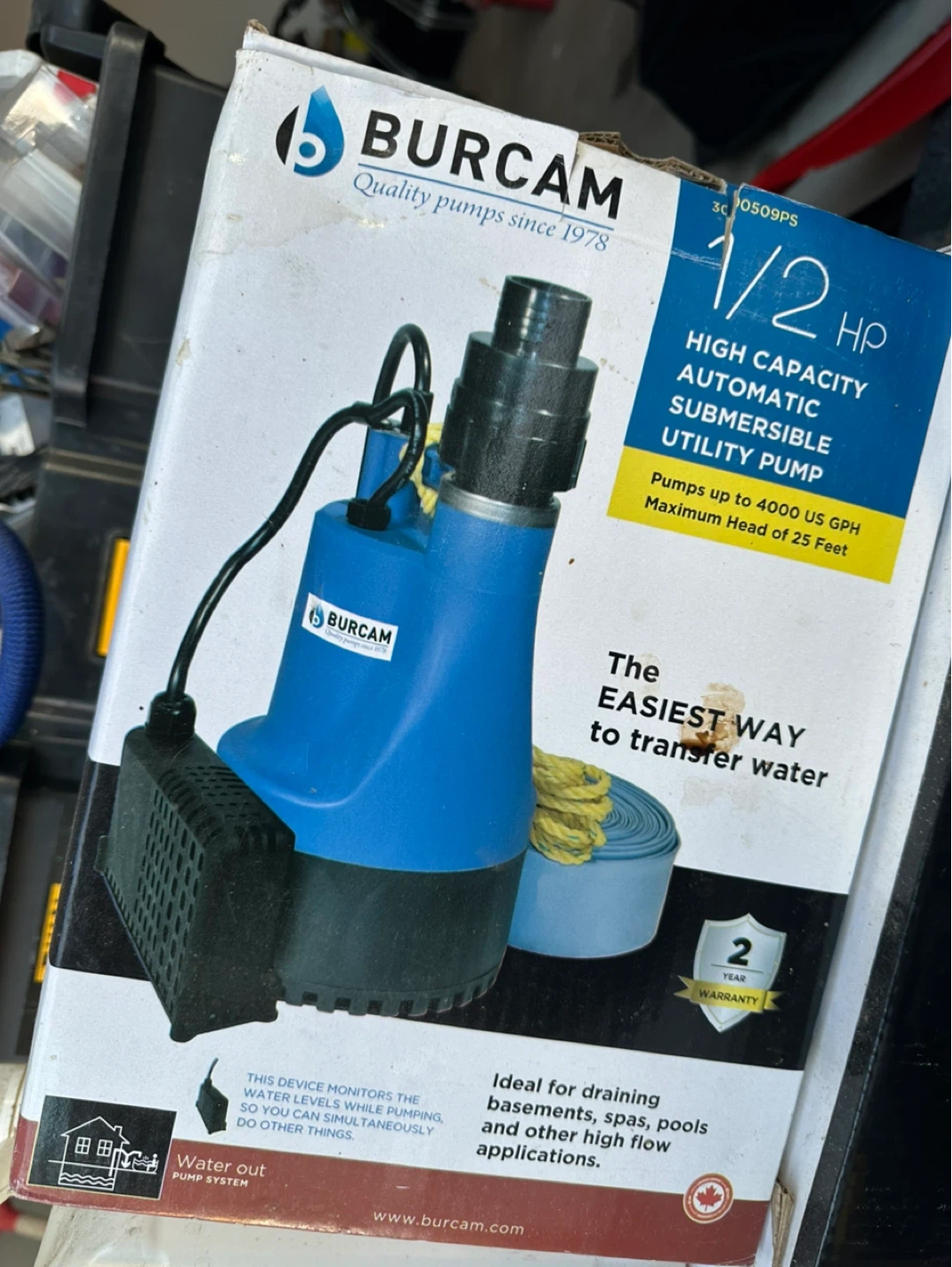 Selling a Burcam 1/2 HP High Capacity Automatic Submersible Utility Pump. It pumps up to 4000 US GPH with a maximum head of 25 feet. Ideal for draining basements, spas, and other high flow applications. This device monitors the water levels while pumping, so you can simultaneously do other things