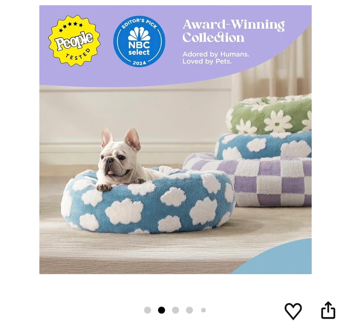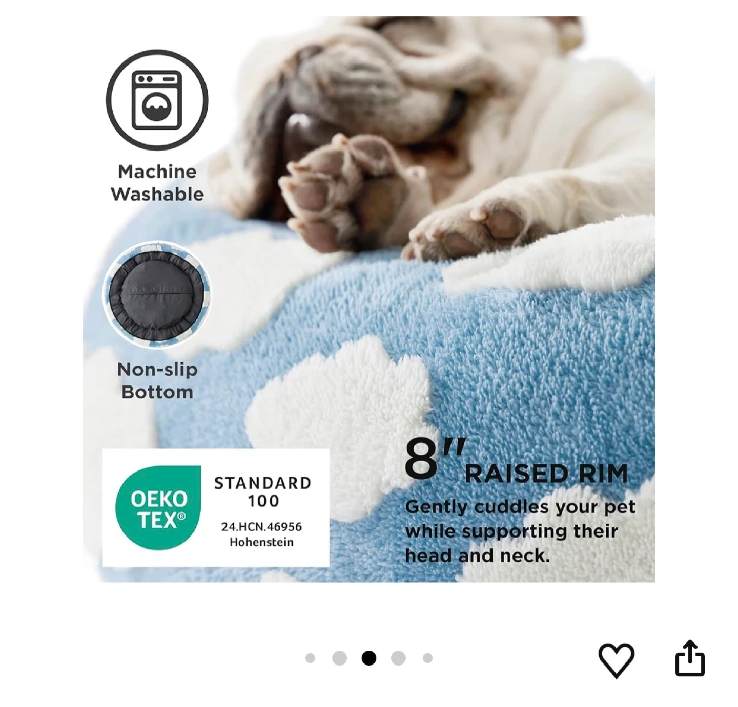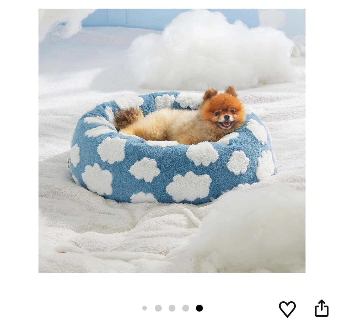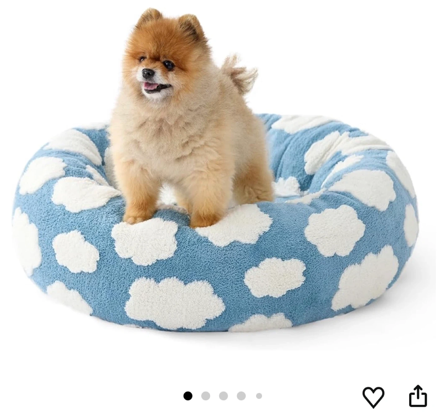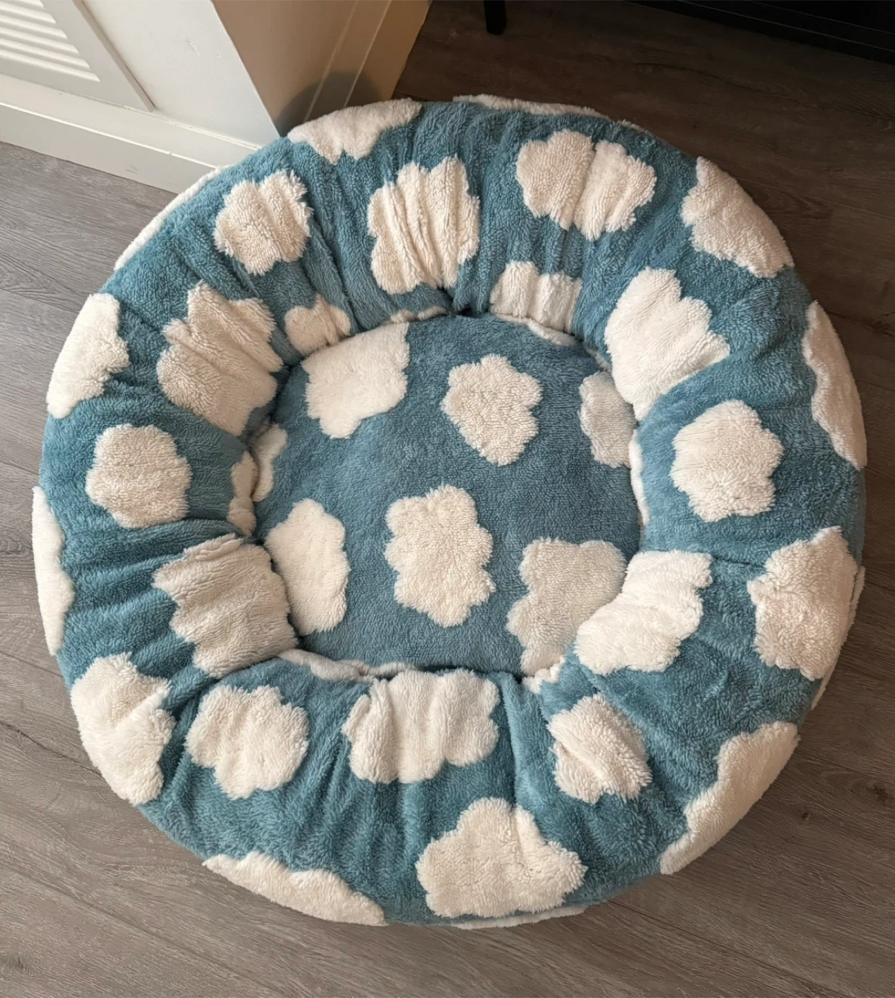 Super soft and comfy plush dog bed with a cute blue-and-white cloud design. Perfect for medium- or small-sized pets to curl up in.
