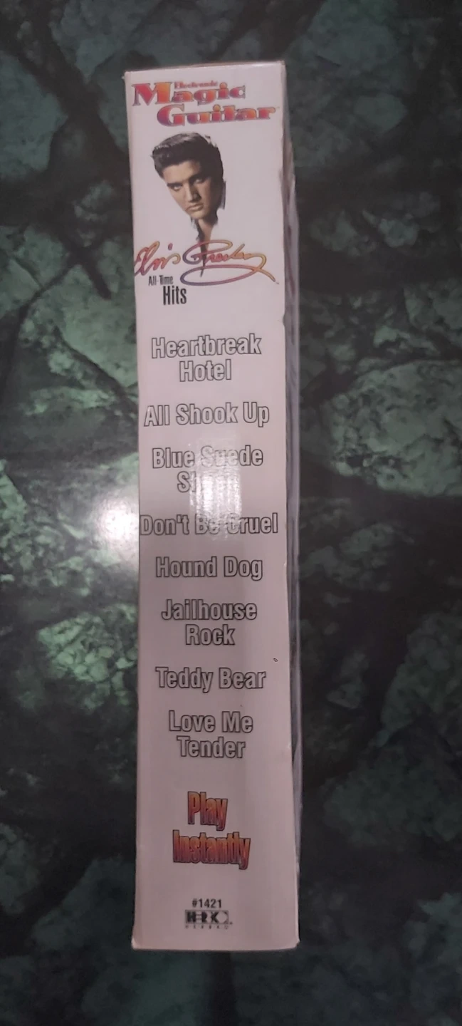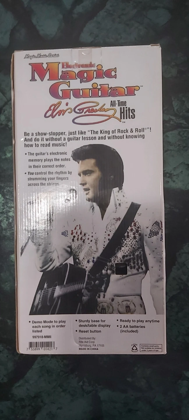 This electronic magic guitar features Elvis Presley's All-Time Hits. It has a memory that plays the notes in the correct order. You control the rhythm by strumming your fingers across the strings. Has been open otherwise great shape, perfect for someone wanting to display!