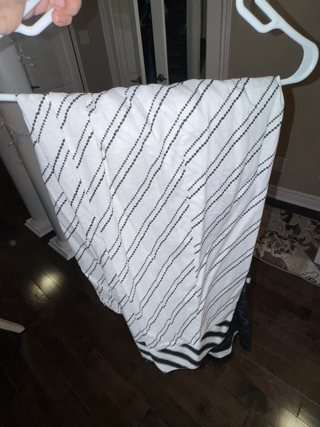 White linen kameez shalwar set with intricate black floral embroidery. Features a V-neckline and long sleeves. Matching striped trouser included. This outfit is suitable for casual or semi-formal wear.