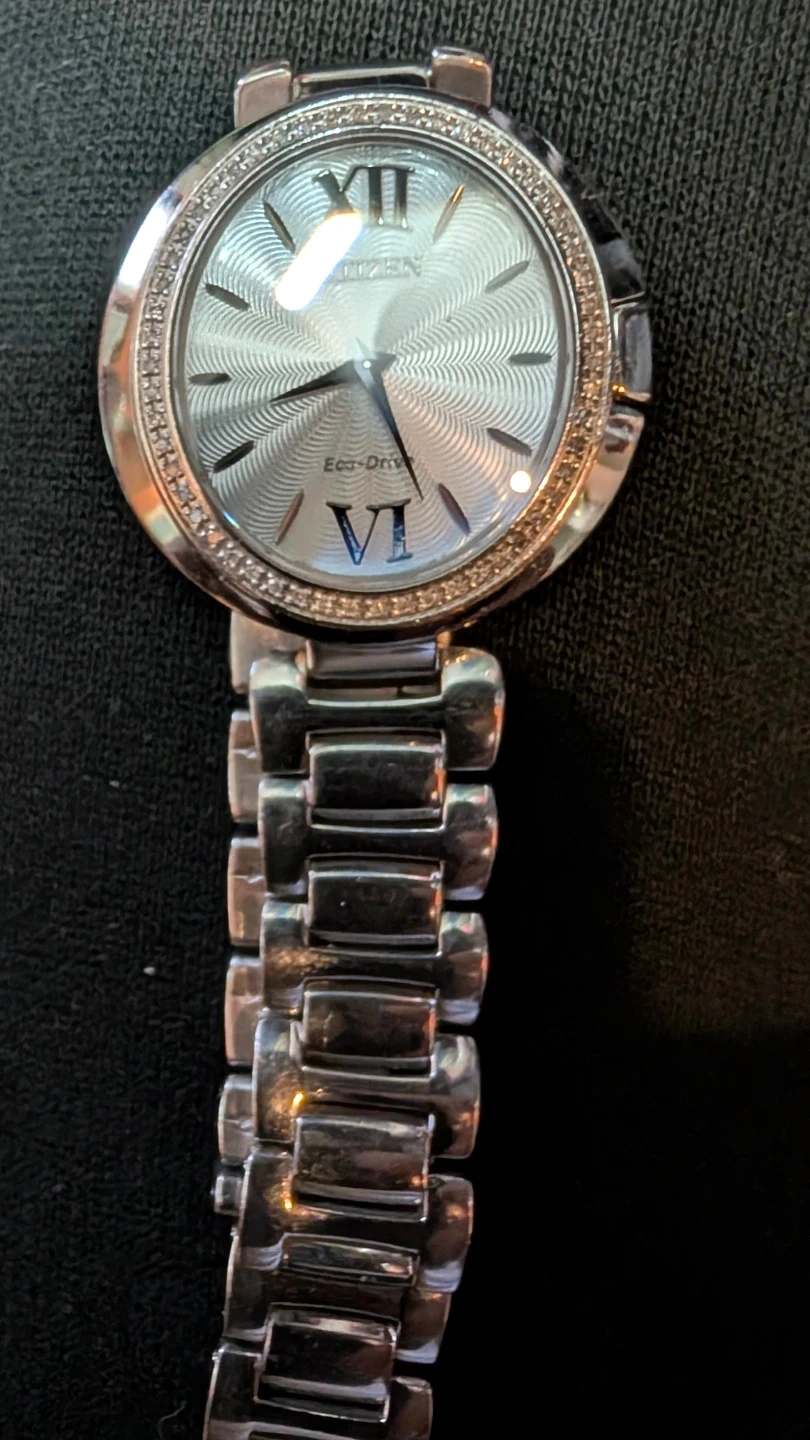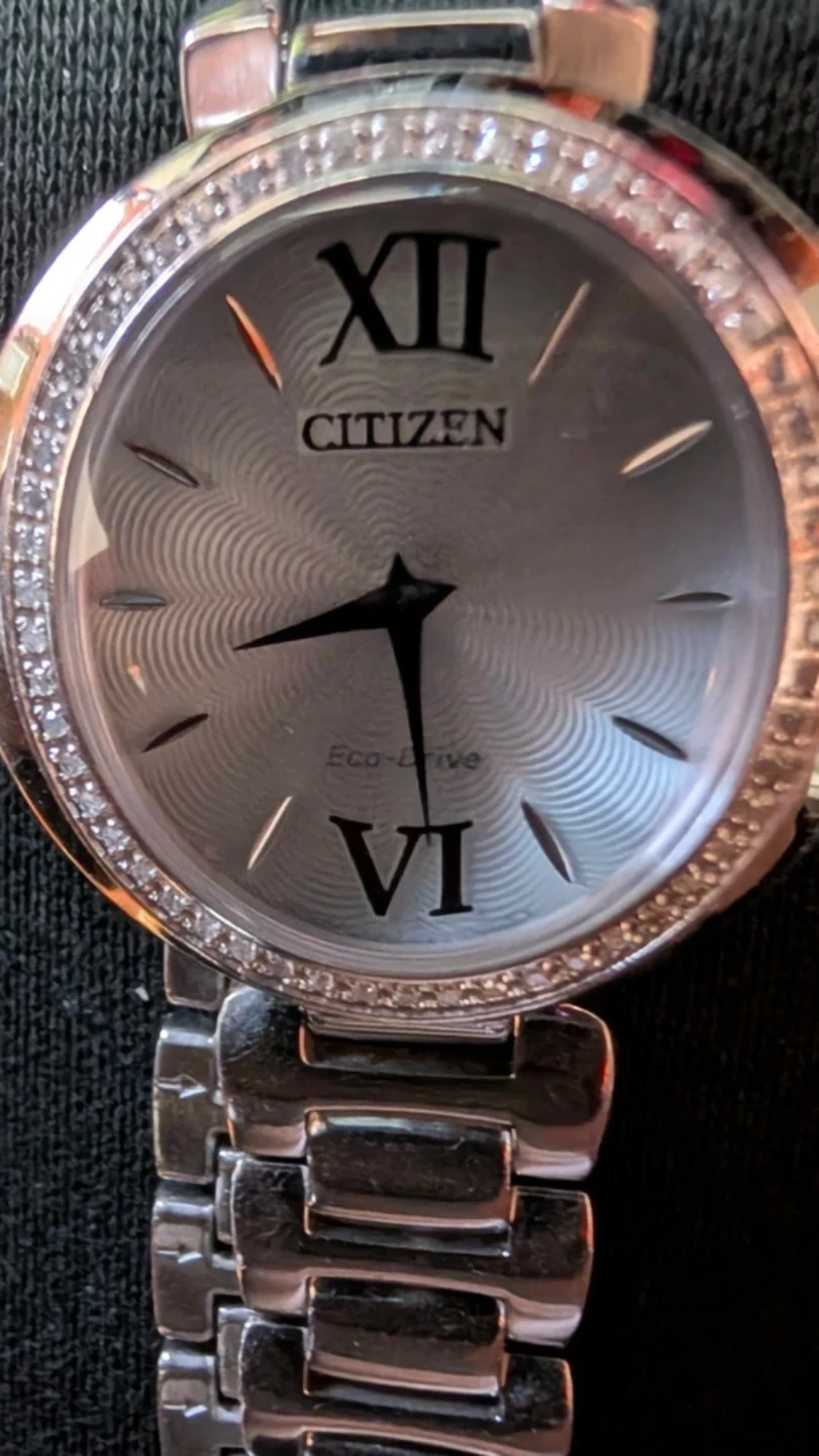 This Citizen Eco-Drive watch features a silver-tone dial with Roman numerals and a date display. It's powered by Eco-Drive technology, meaning it charges with light. The watch has a stainless steel band and a bezel accented with small stones. Water resistant.
