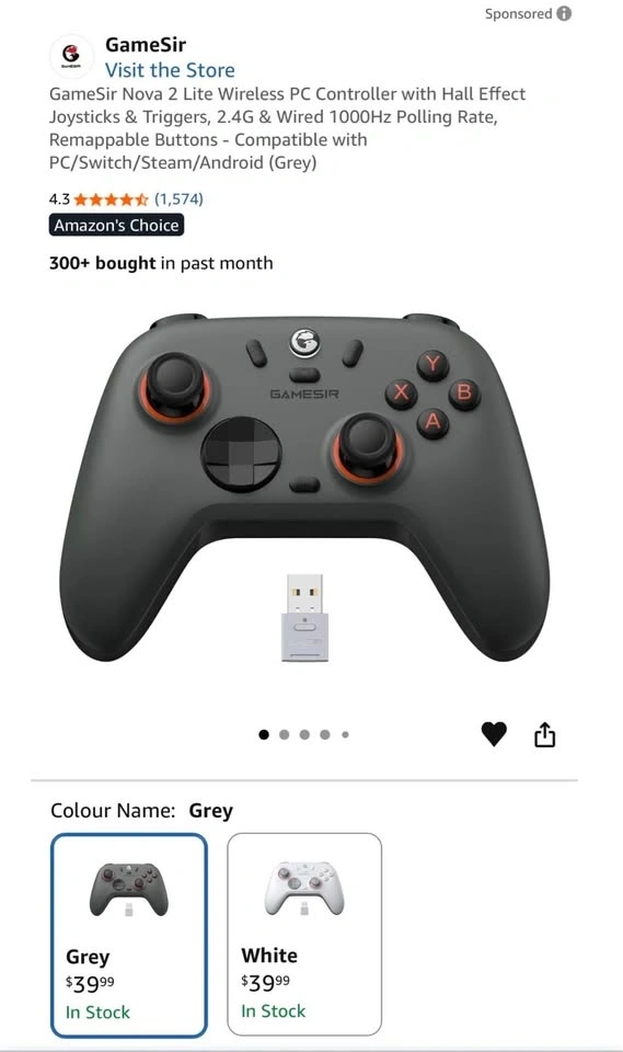 GameSir Nova 2 Lite Wireless PC Controller with Hall Effect Joysticks & Triggers, 2.4G & Wired 1000Hz Polling Rate, Remappable Buttons - Compatible with PC/Switch/Steam/Android (Grey)