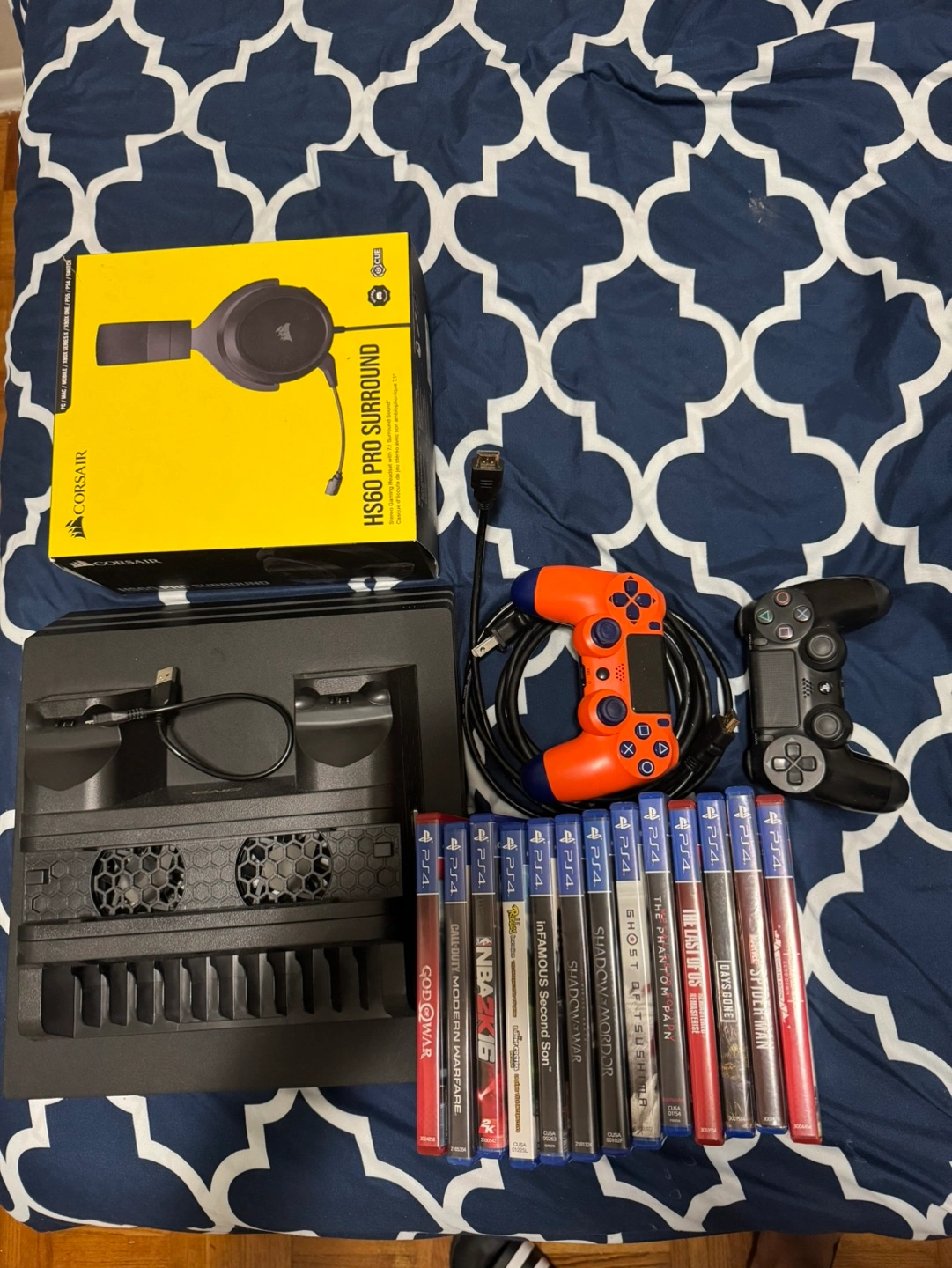 PS4 console 1TB with multiple games and accessories, including a charging dock, 2 controllers, and a Corsair gaming headset.