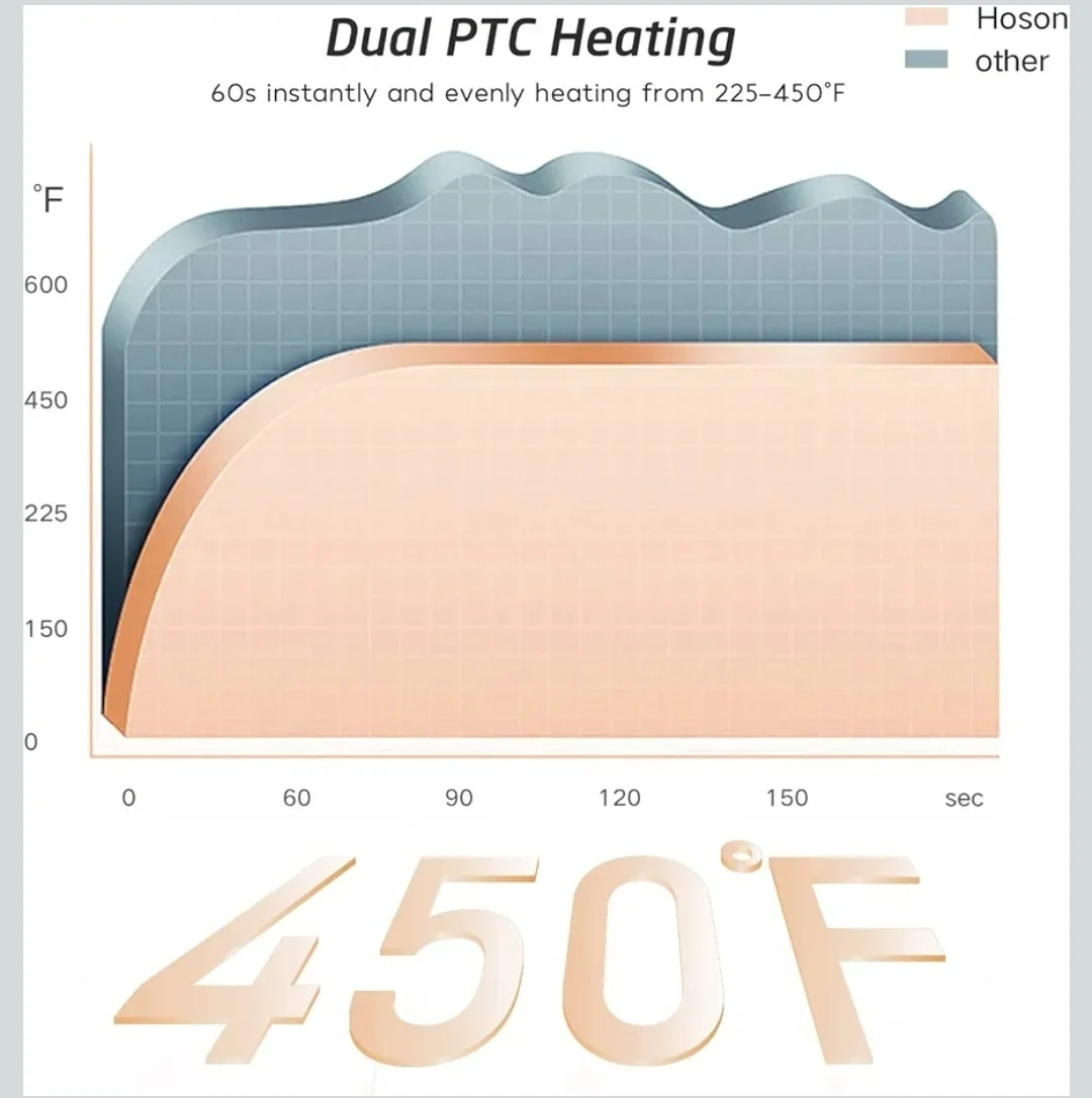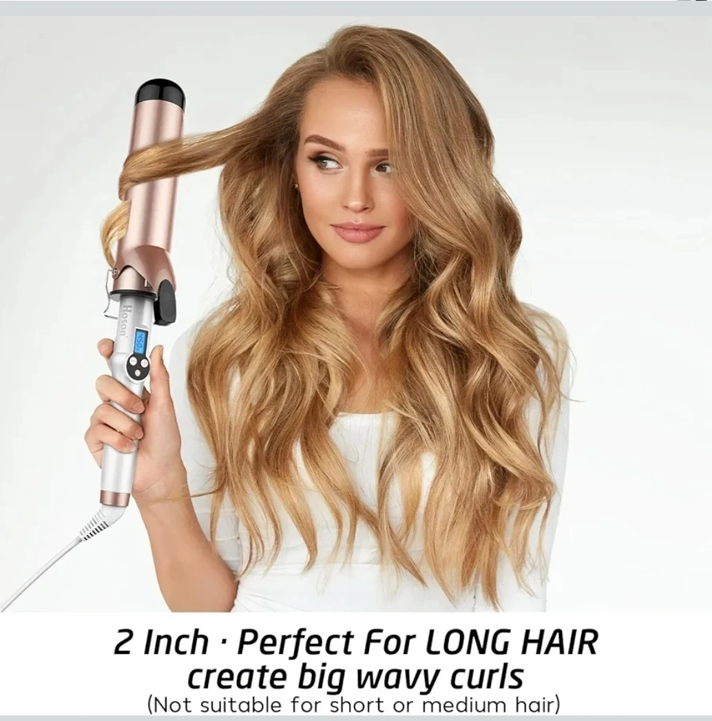 This Hoson curling iron has a 2-inch barrel with Tourmaline Ceramic coating. It features an LCD display and adjustable temperature settings from 225°F to 450°F. The cord is 360-degree rotatable. It's perfect for creating large waves on long hair.