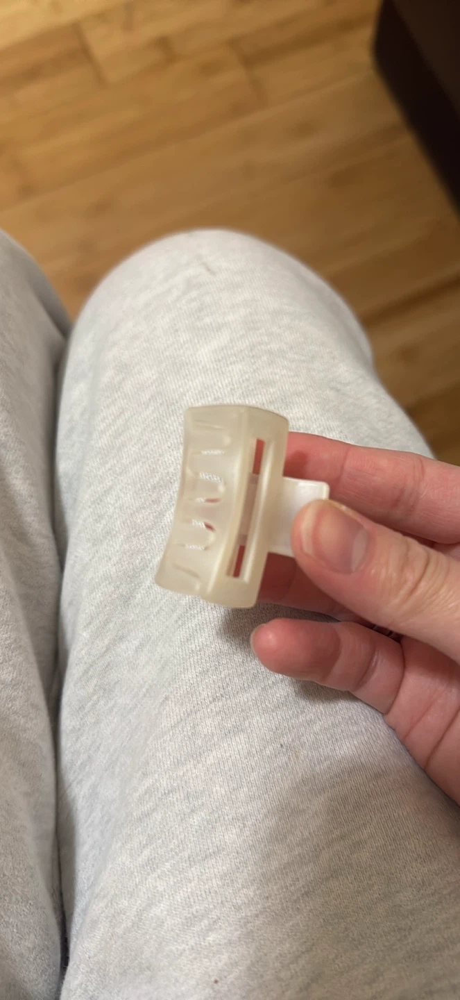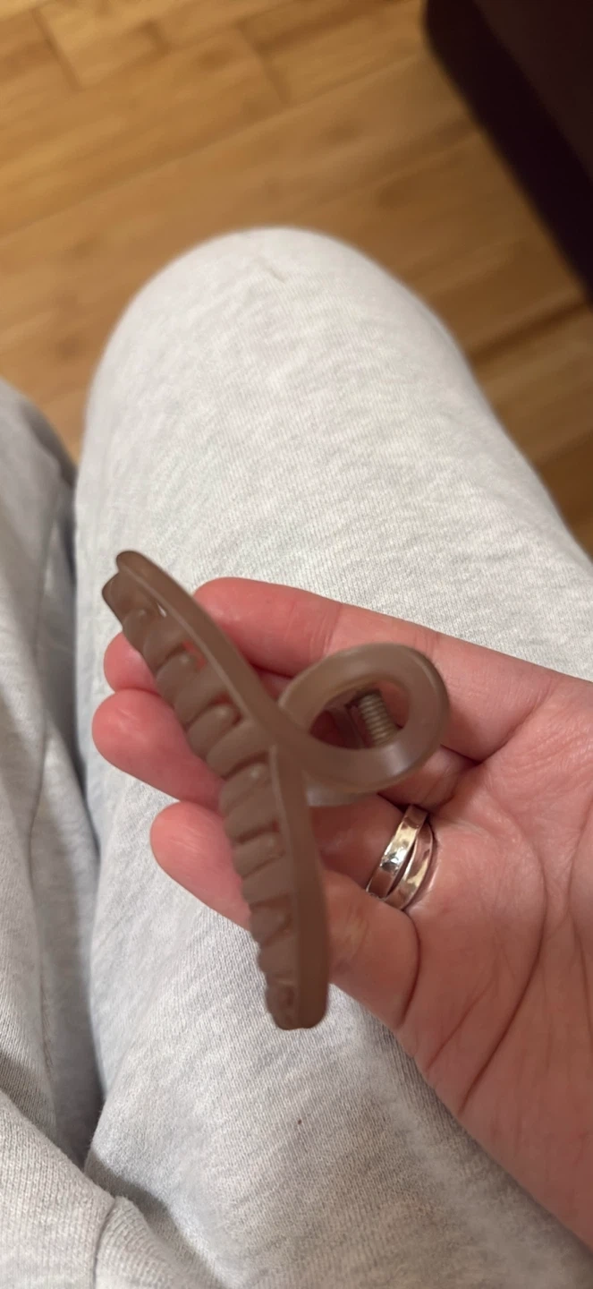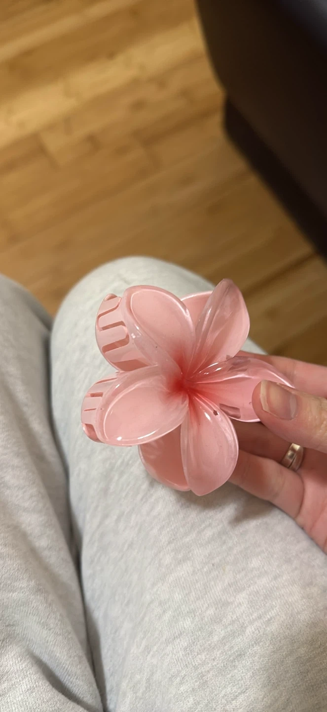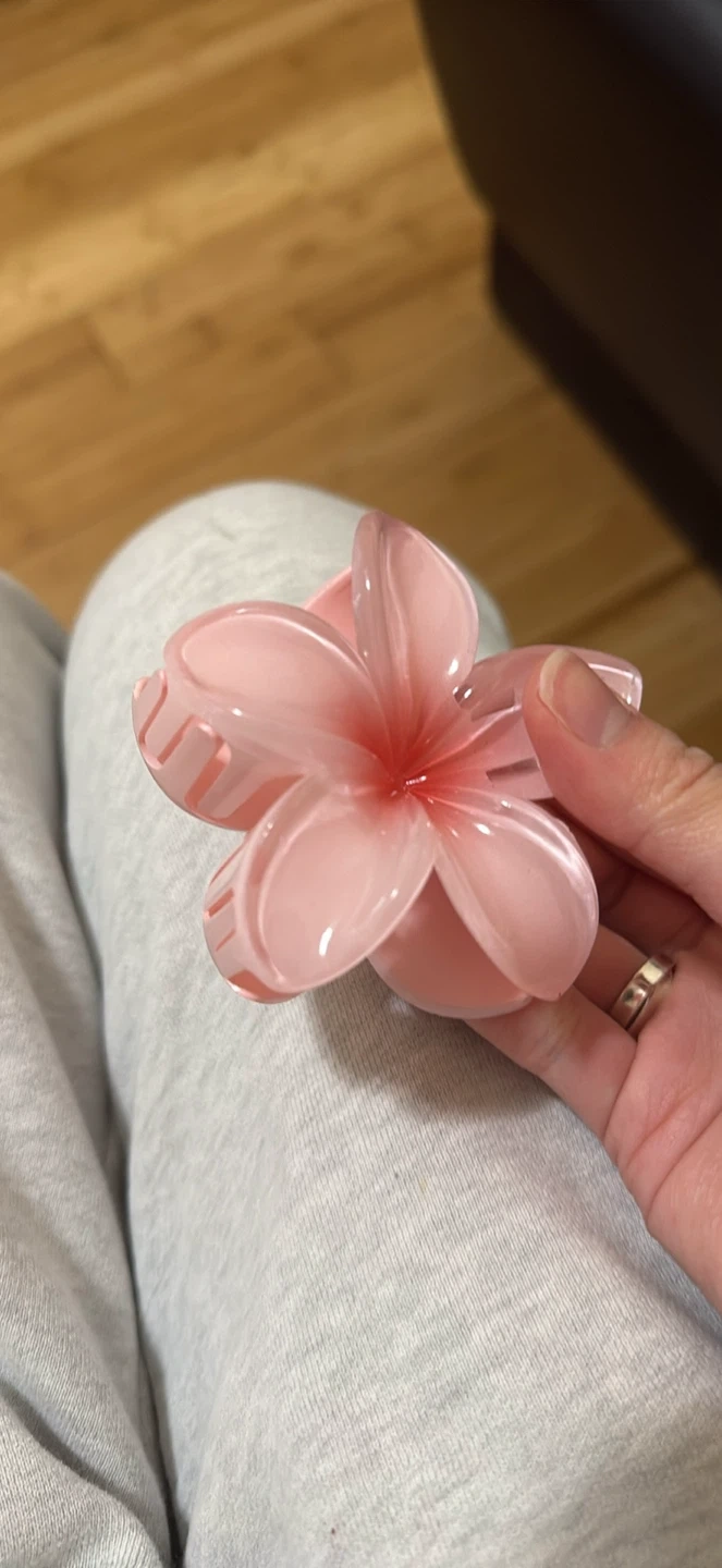 Includes a frosted white, brown, and pink flower-shaped hair claw clip. These clips are made of plastic and designed for holding hair.