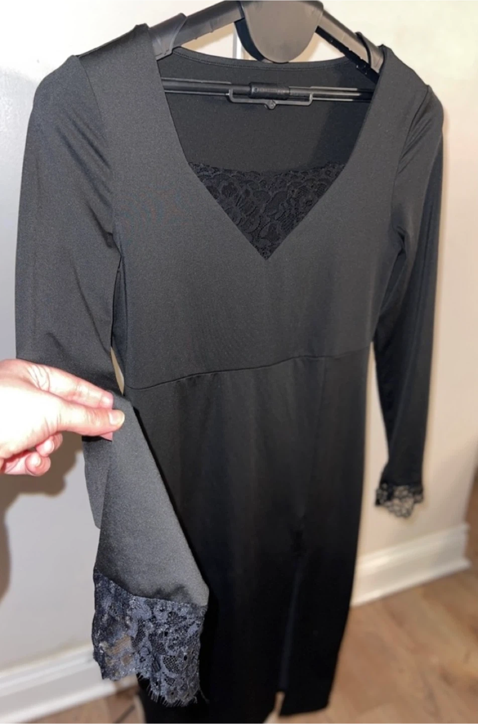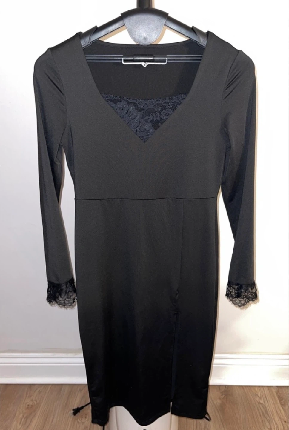Black Lace Trim Split Thigh Long Sleeve Bodycon Midi Dress