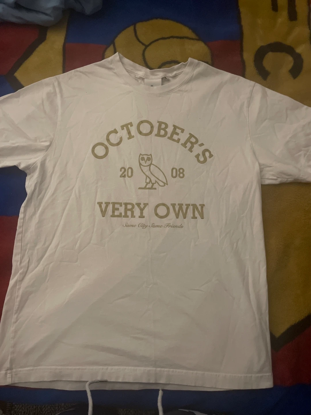 White short-sleeve t-shirt from October's Very Own. Features the OVO owl logo and 'Same City Same Friends' text. Size is small. Made in Portugal.