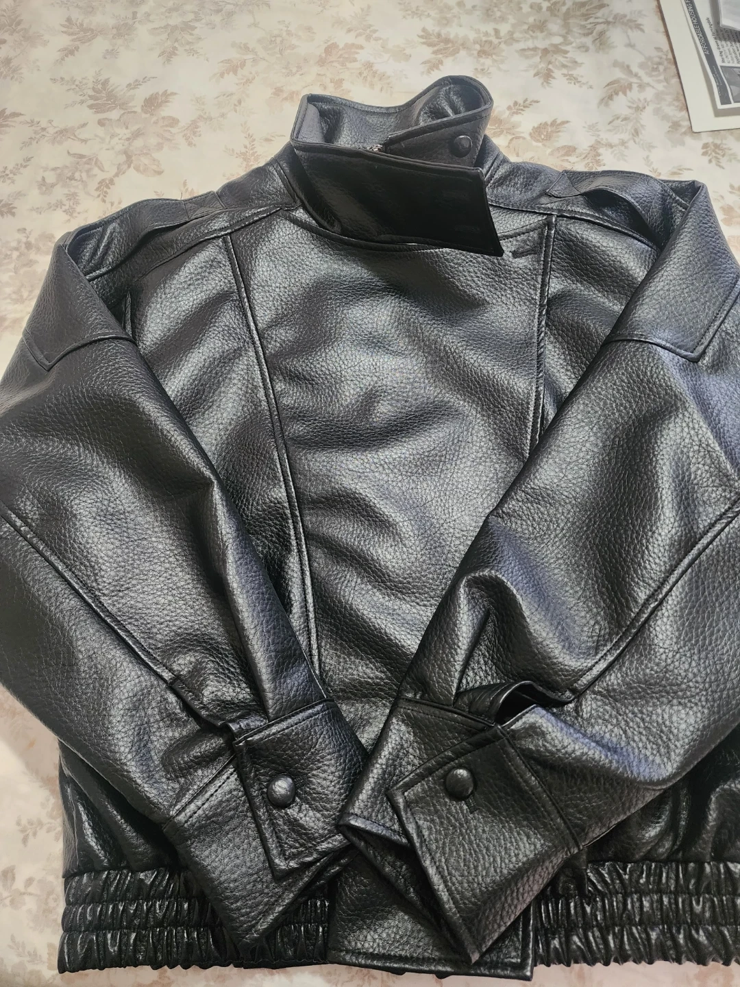 Black faux leather jacket with a zip-up front and snap collar. Features include buttoned cuffs and an elasticated hem. Material is faux leather.