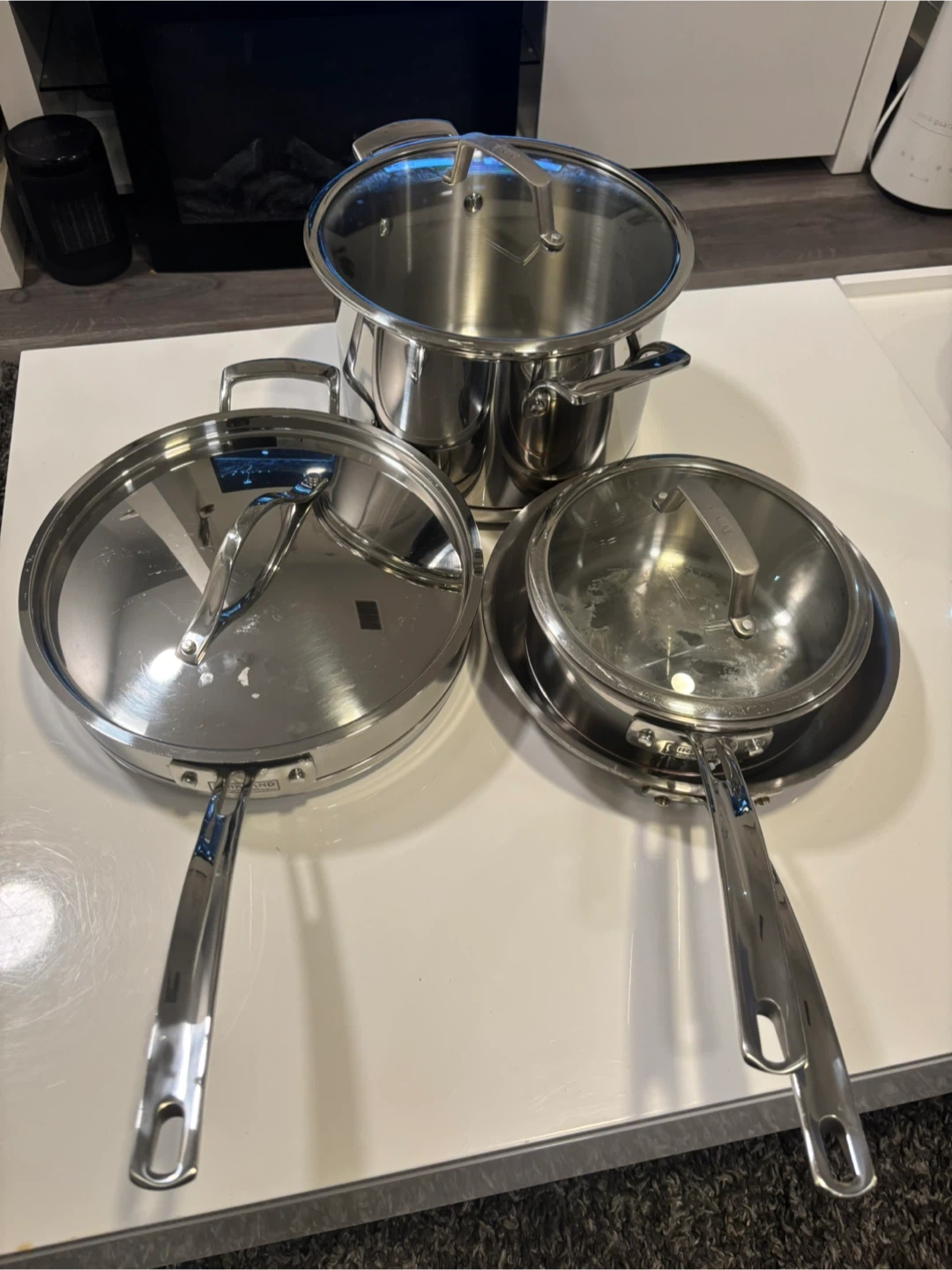 This is a set of All-Clad stainless steel pots and pans. It includes a large stockpot, a frying pan, and a saucepan, all with lids. They're made from durable stainless steel. 2 cover missing