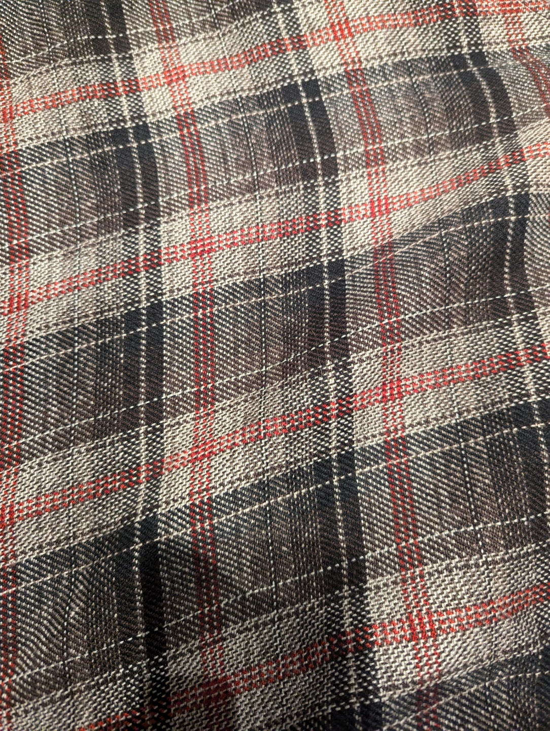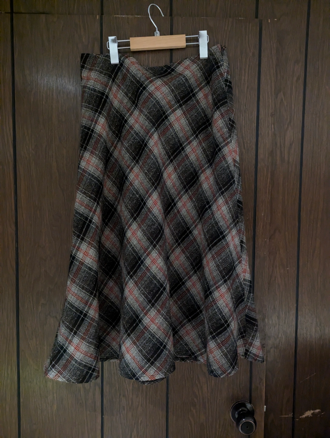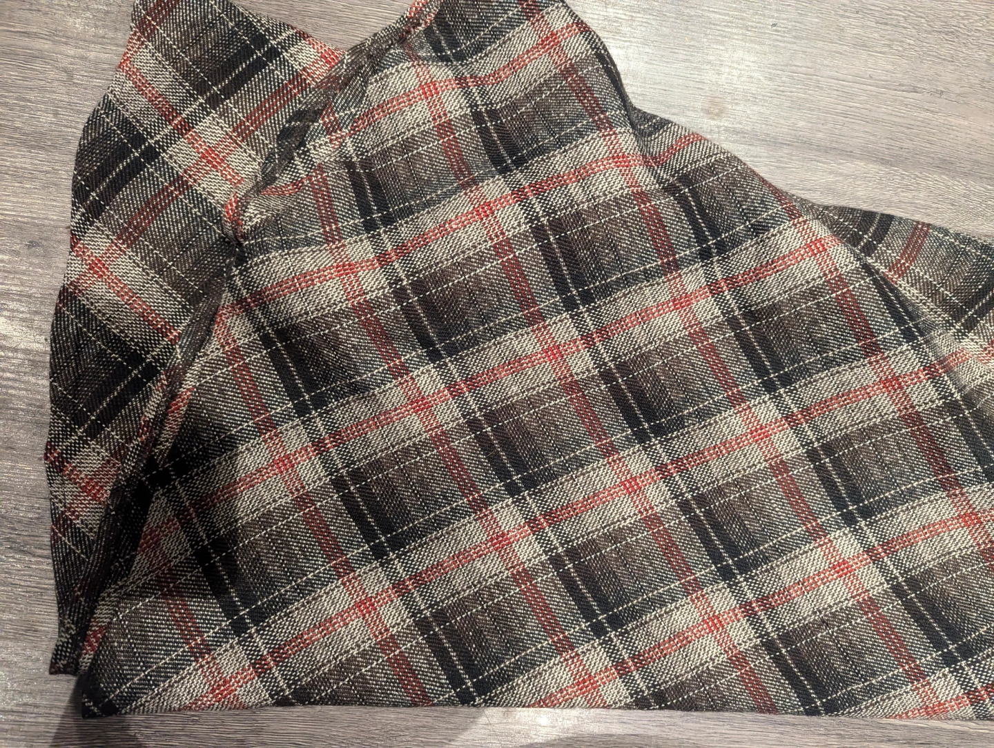 Women's A-line skirt. Brown, beige, and red plaid pattern. Made in Canada. Cotton & acrylic blend. Size 6. Excellent condition.