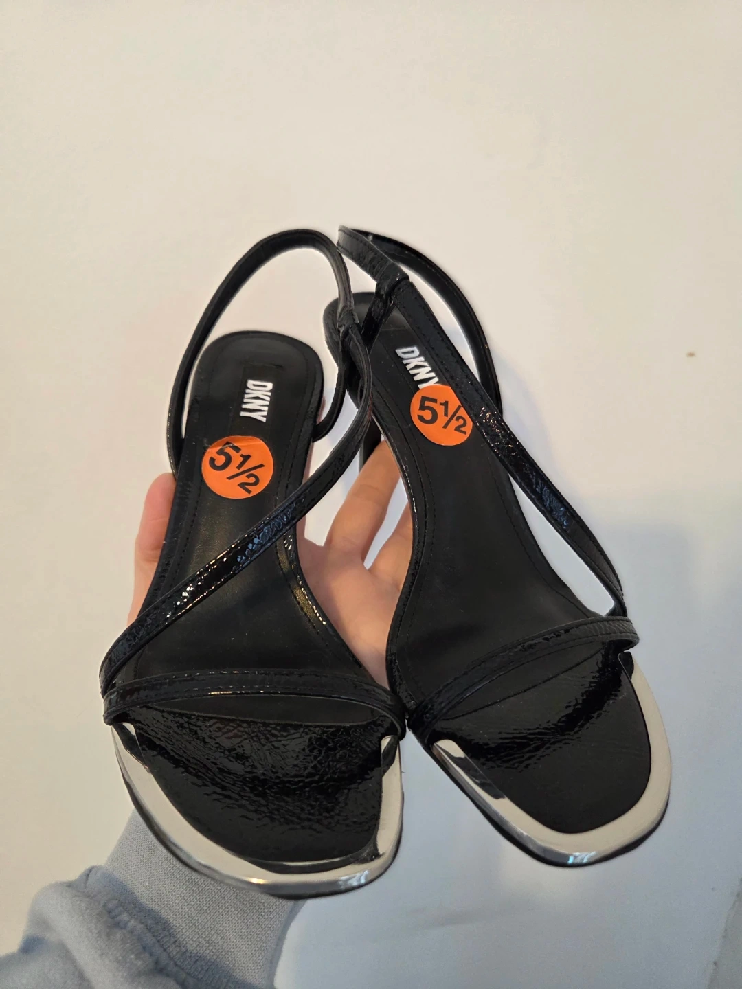 Brand new DKNY black patent heeled sandals in size 5.5. Features a sleek design with silver-tone toe caps and adjustable ankle straps. These stylish heels are perfect for dressing up any outfit! $10