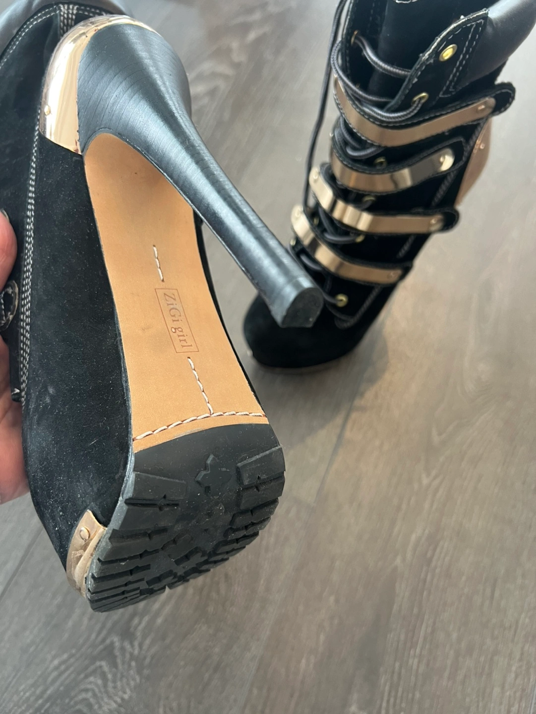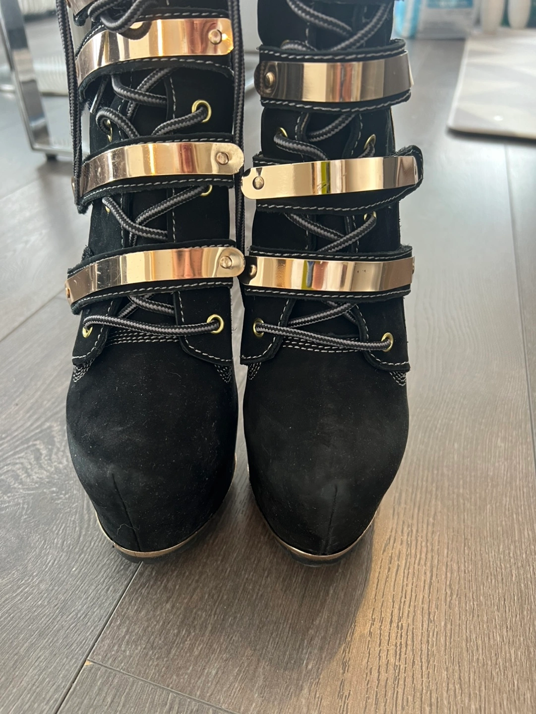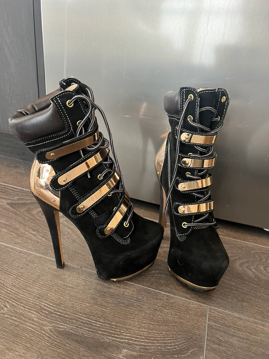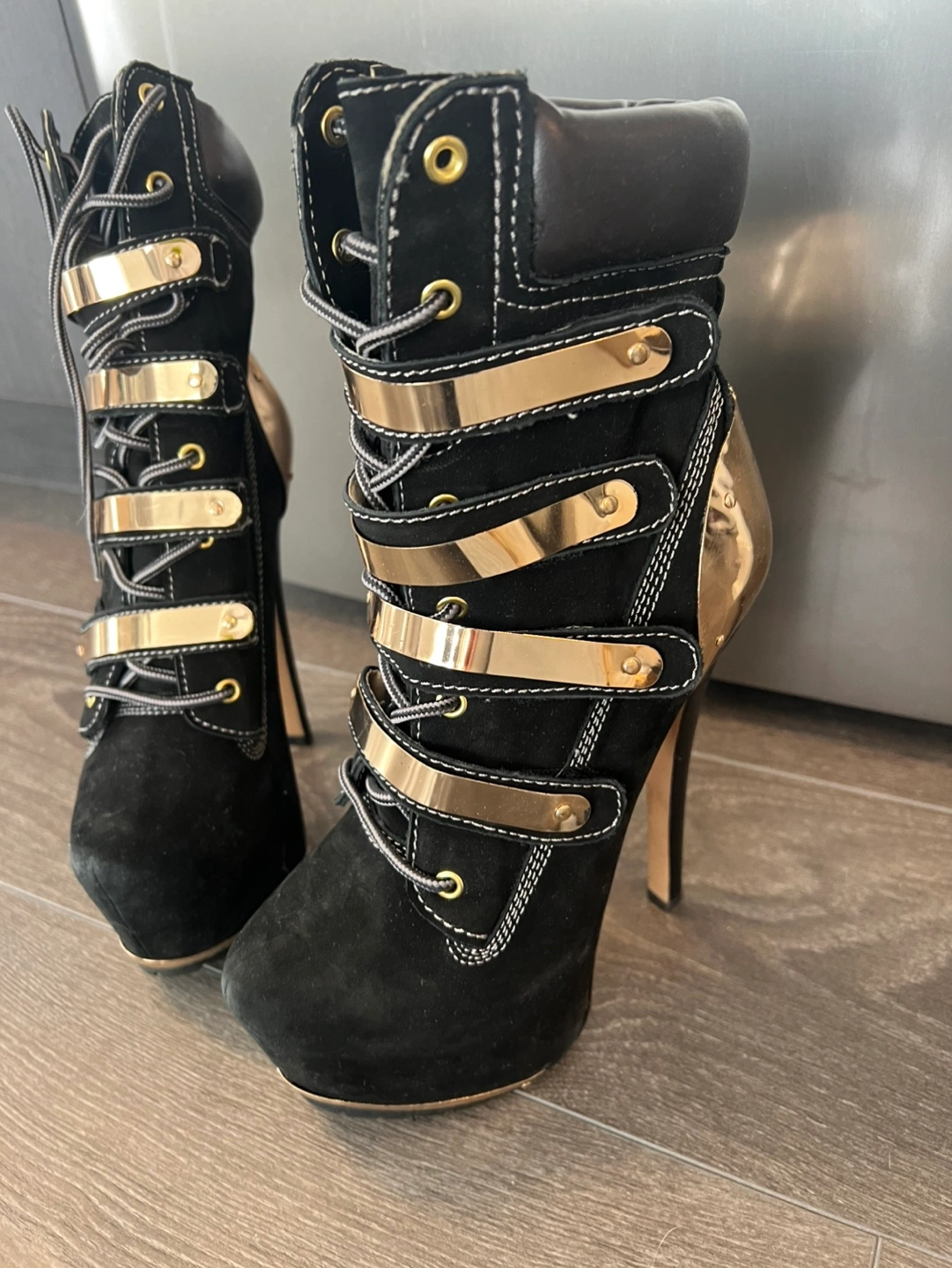 Black suede platform boots. Gold accents. Lace-up closure. High heels. Excellent condition. Never used , original price $350