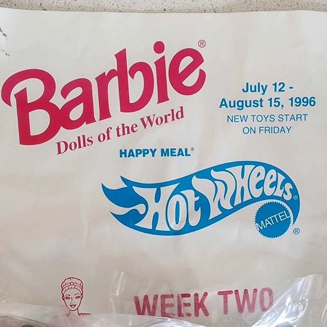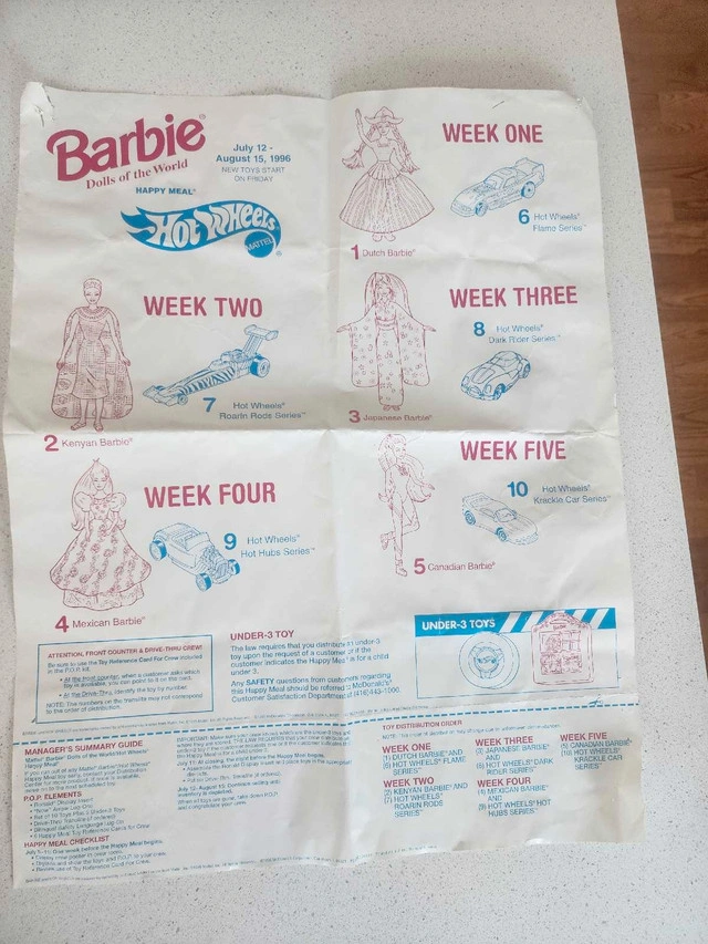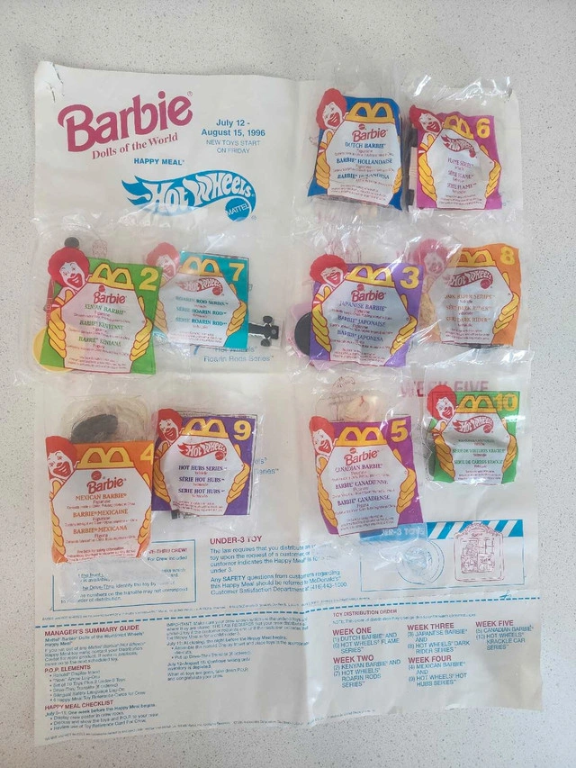 I'm offering a complete set of 1996 McDonalds Barbie and Hot Wheels Happy Meal toys and advertising materials, a nostalgic collection for any fan or collector. The items are in their original packaging from 1996 and the advertising materials are in acceptable condition. This set includes all the toys released during the promotion, offering a trip down memory lane. Because if my ad is up, my toys are up for grabs!