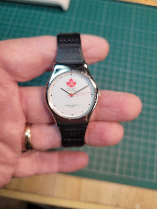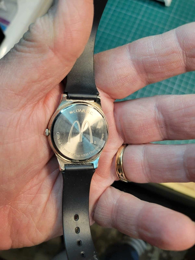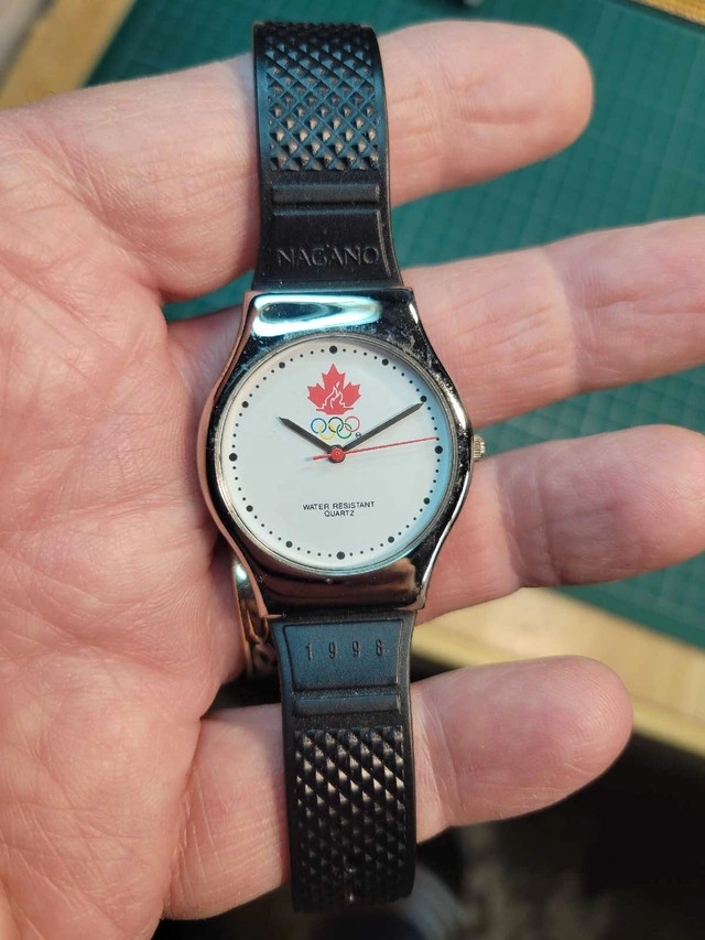 Capture a piece of Canadian sporting history with the 1998 McDonald's Canada Nagano Olympic Watch. A true vintage gem from the 1980s, this wristwatch celebrates the spirit of the Olympic games with its striking multicolor dial and a two-piece strap that comfortably fits unisex adult wrists. The silver stainless steel case and bezel provide a sleek contrast, while the black plastic band adds a durable and practical touch. Function meets style in this sporty timepiece, featuring a reliable quartz movement and a convenient push/pull crown for easy adjustments. Its round, analog display ensures timekeeping is both effortless and stylish. Although it comes without its original box, the watch's charm lies in its historic insignia and the timeless design that commemorates the iconic 1998 Nagano Olympics.