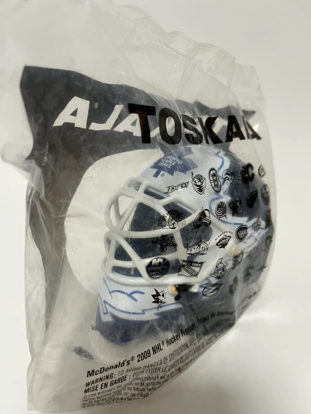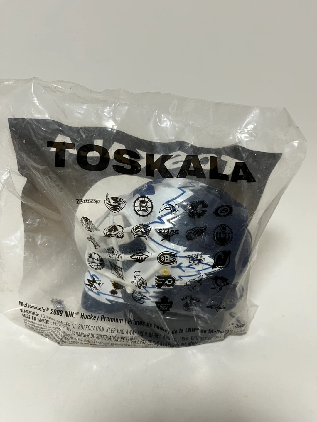 130Selling a McDonald's 2009 NHL Hockey Premium Toskala mask, still in its original packaging! It features various NHL team logos. Perfect for any hockey fan or collector