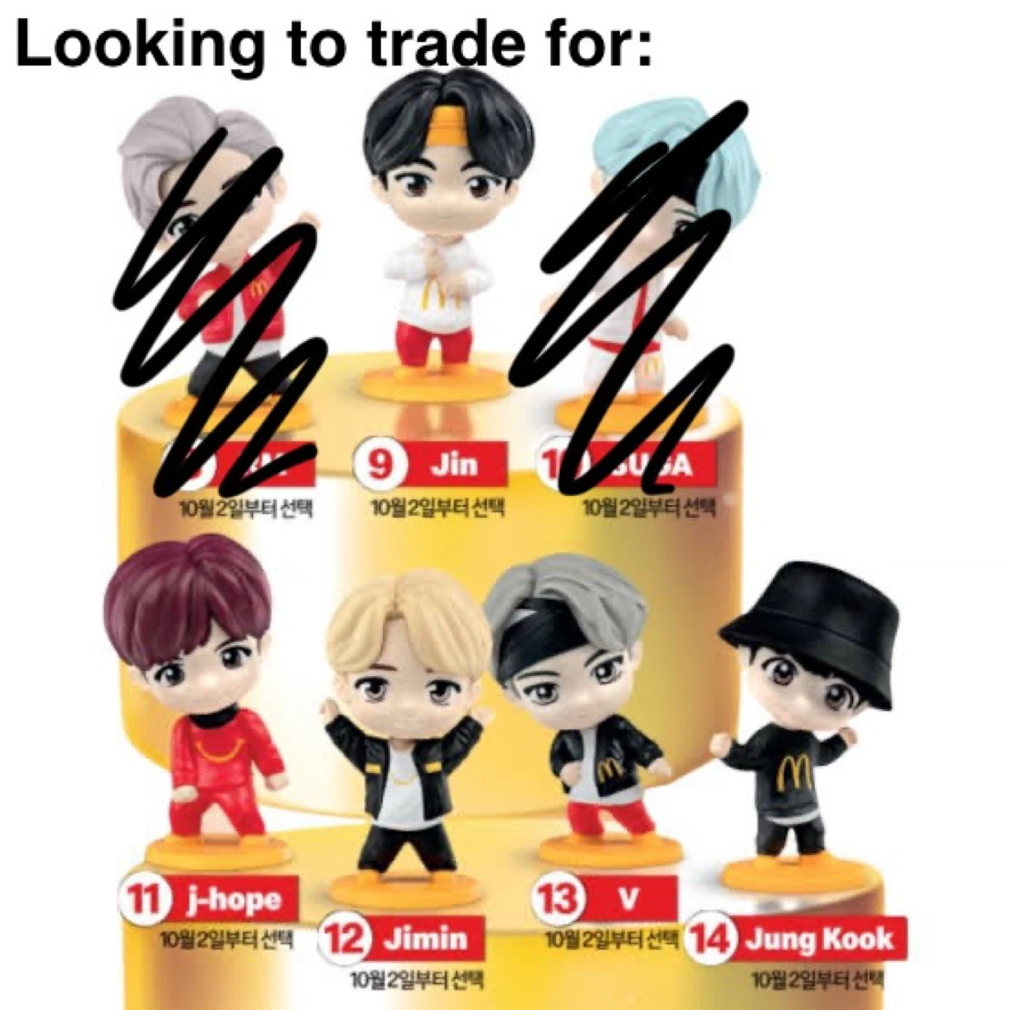 149McDonald’s TinyTan Throwback Edition Jimin (5), RM (1) for trade or sale. Will trade two of Throwback Edition for one Encore Edition Jin (9), Jimin (12), V (13) or Jk (14). Selling for $3 each. Can meet up Eaton Center, Scarborough Town Center or Kennedy Station. Suga (3) sold.