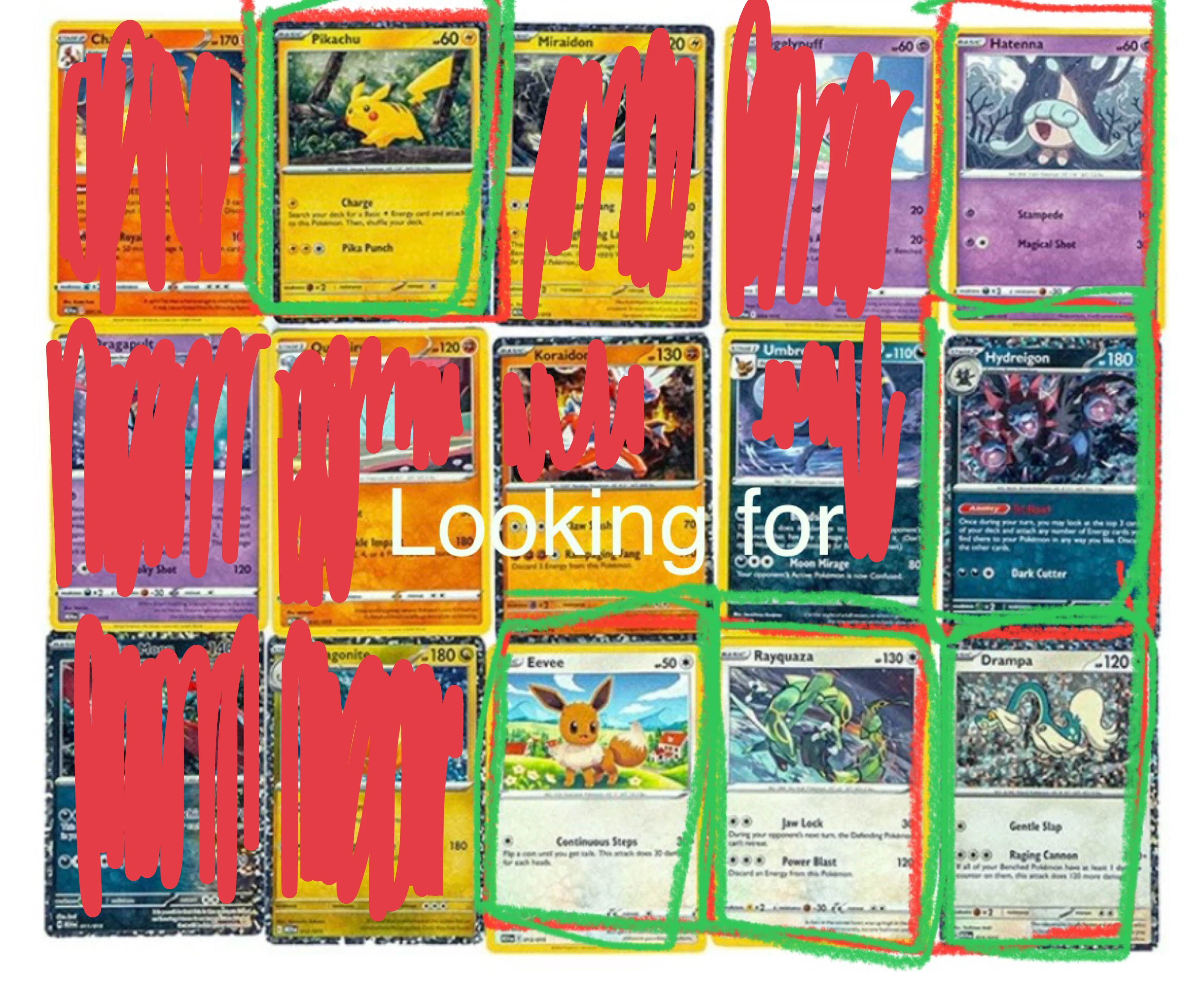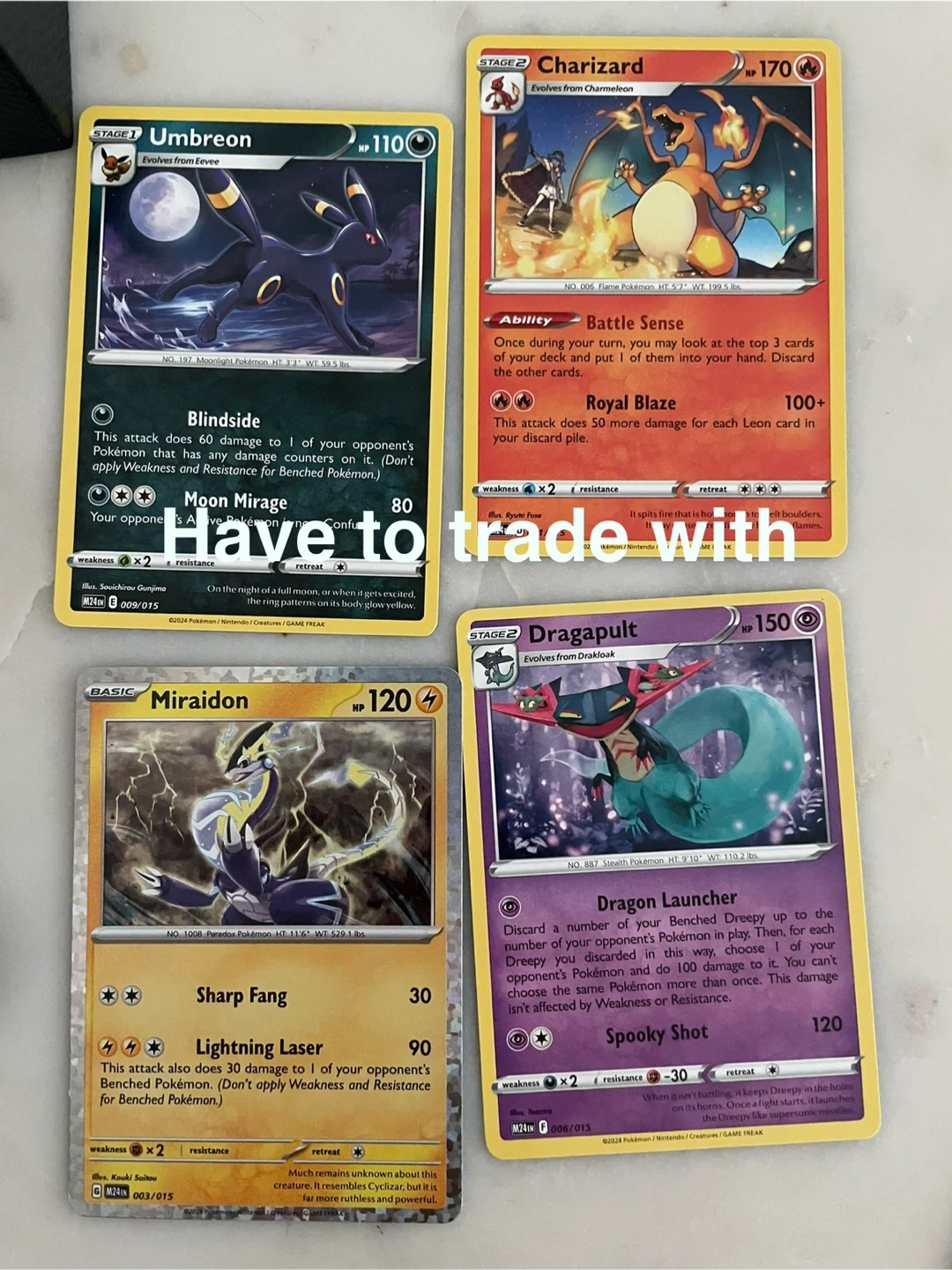 Looking to complete my set. See second photo, have extras to trade: Umbreon, Charizard, Miraidon, and Dragapult