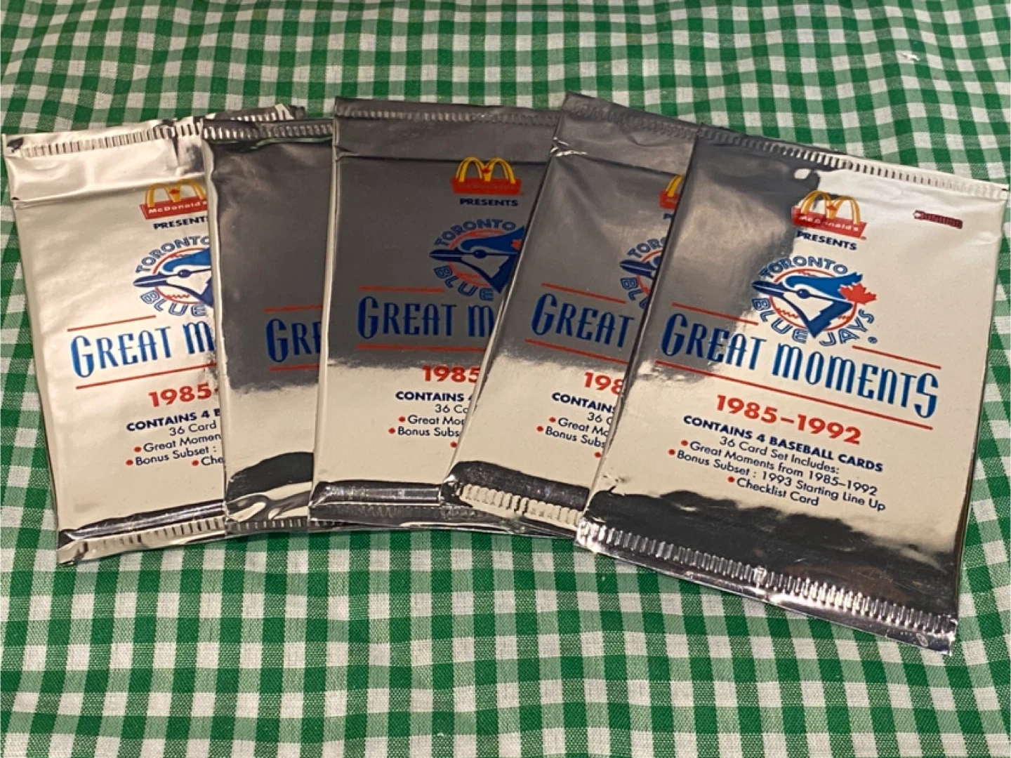 Selling five packs of McDonald's Toronto Blue Jays Great Moments baseball cards from 1985-1992. Each pack contains 4 baseball cards. These are licensed by the Major League Baseball Players Association and the Toronto Blue Jays, ©1993 McDonald's Restaurants of Canada Limited. Pickup only, Kipling and Highway 7 area of Woodbridge.