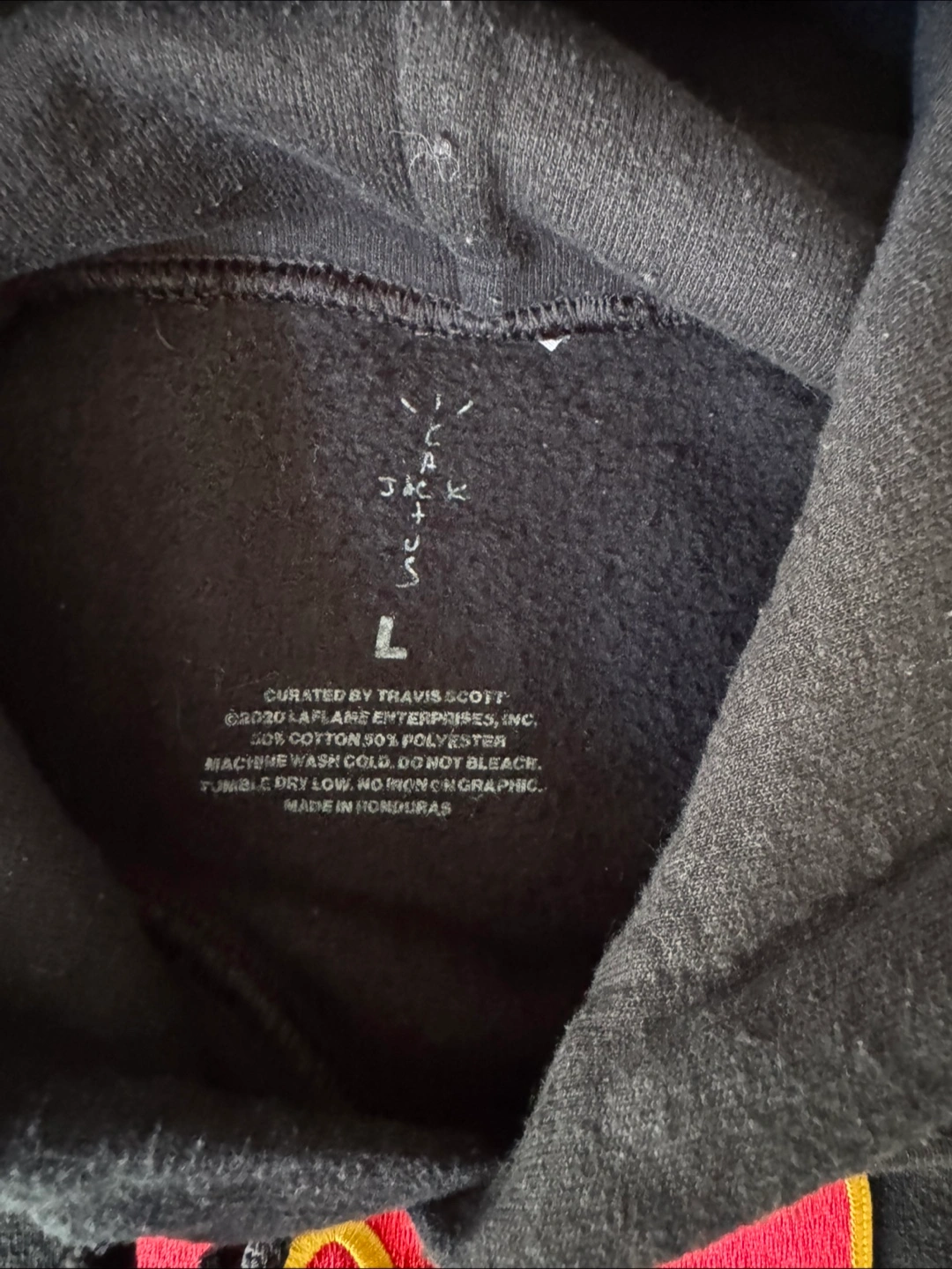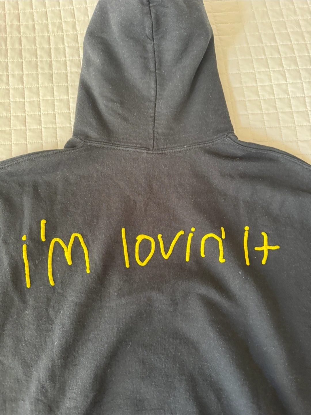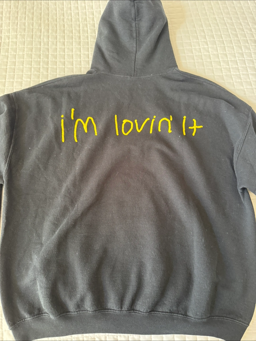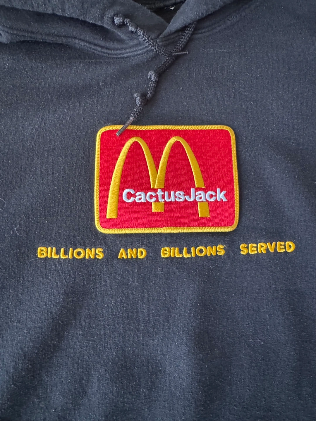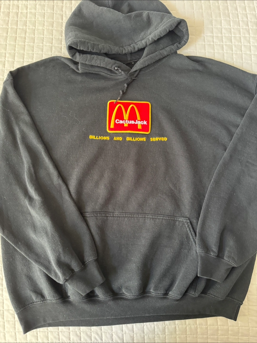 Selling a McDonald's x Travis Scott "Cactus Jack" hoodie. It's black and features the iconic McDonald's logo with "Cactus Jack" on the front. The back says "I'm lovin' it". It is in used condition.