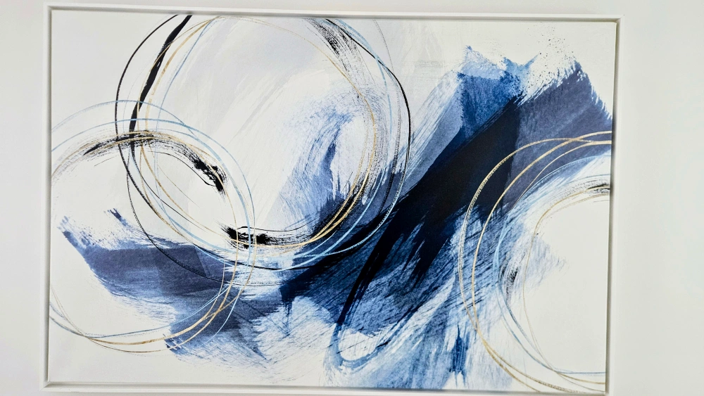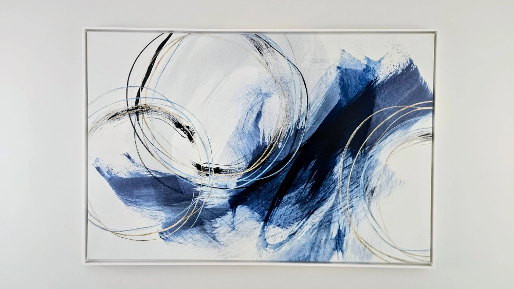 Large abstract canvas print with blue, black, and gold circular brushstrokes. Piece is set in a thin white floating frame. Primary colors are navy blue and white with metallic gold accents.