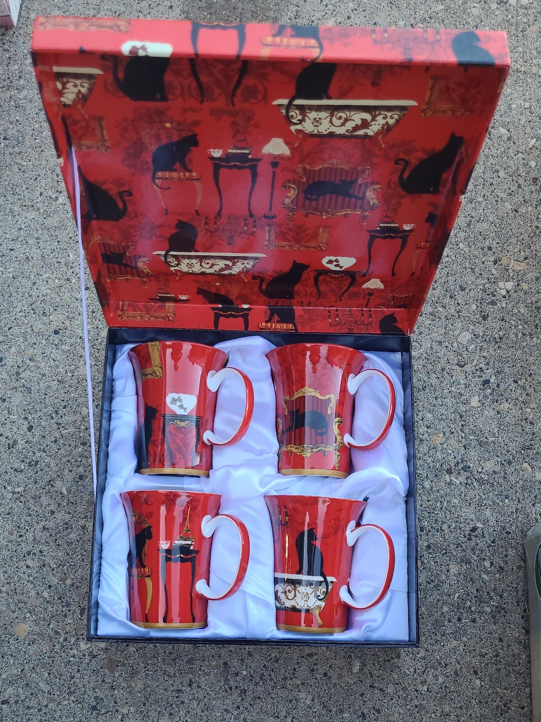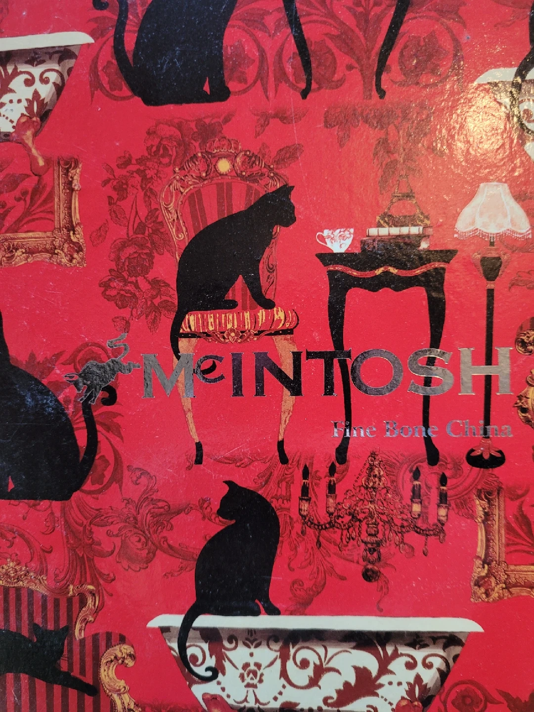 63Here's a set of four McIntosh Fine Bone China mugs in mint condition, complete with the original box! They feature a charming cat design on a red background. These mugs would be perfect for any cat lover or as a unique addition to your collection