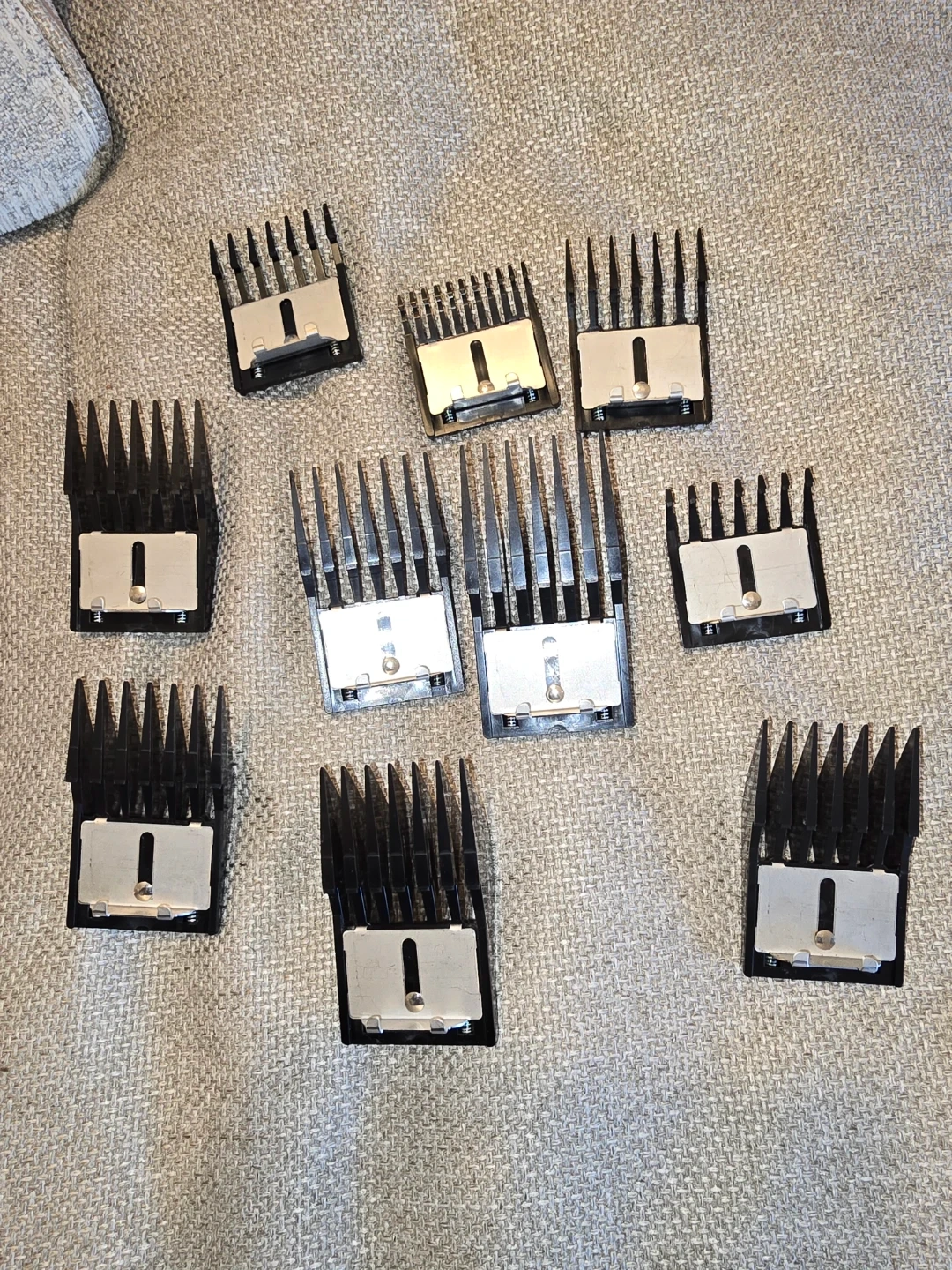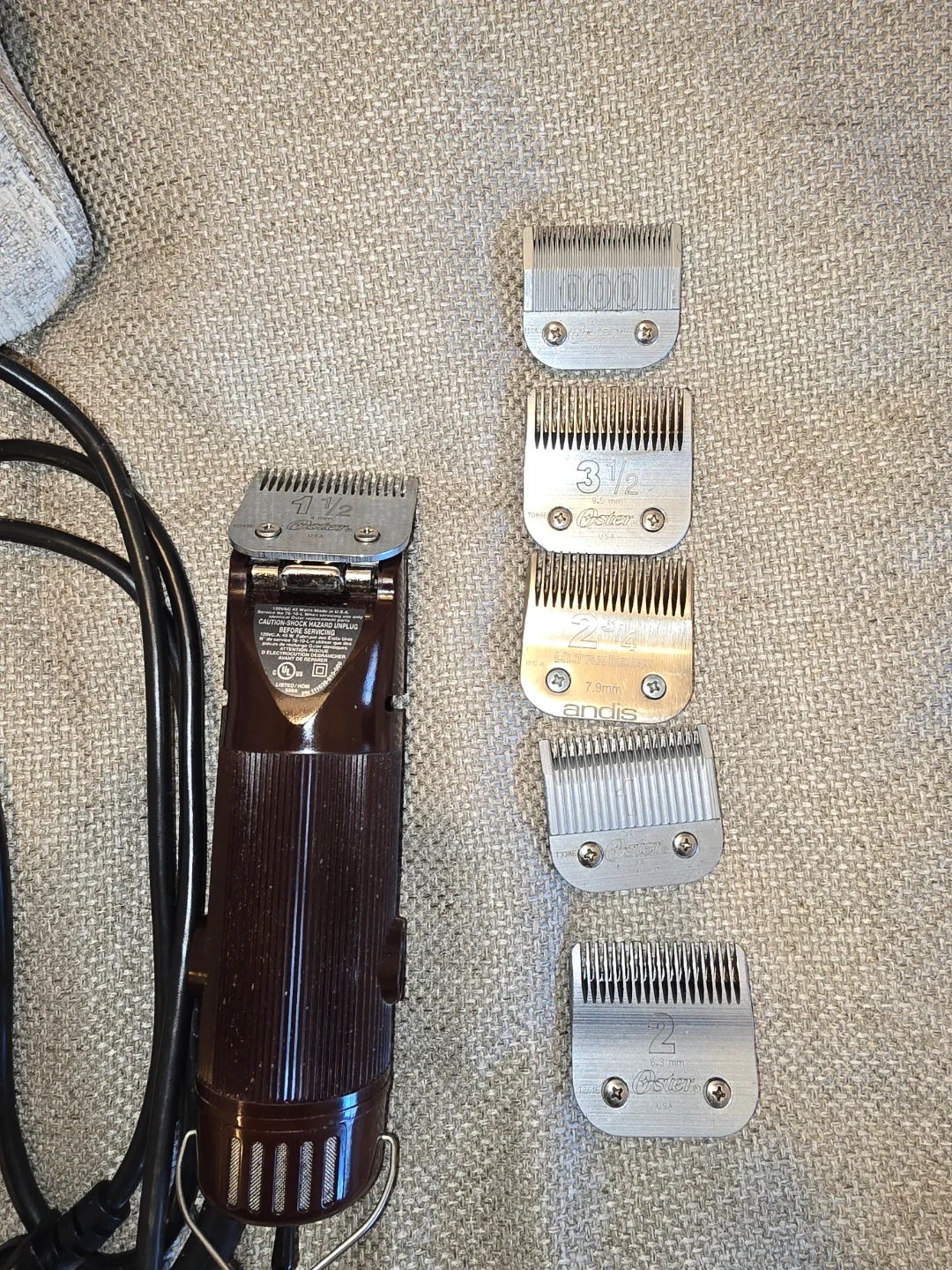 Oster Classic 76 hair clipper with a maroon body. It comes with seven detachable blades in various sizes. Also includes 10 guards. This is a professional grade clipper for haircuts.
