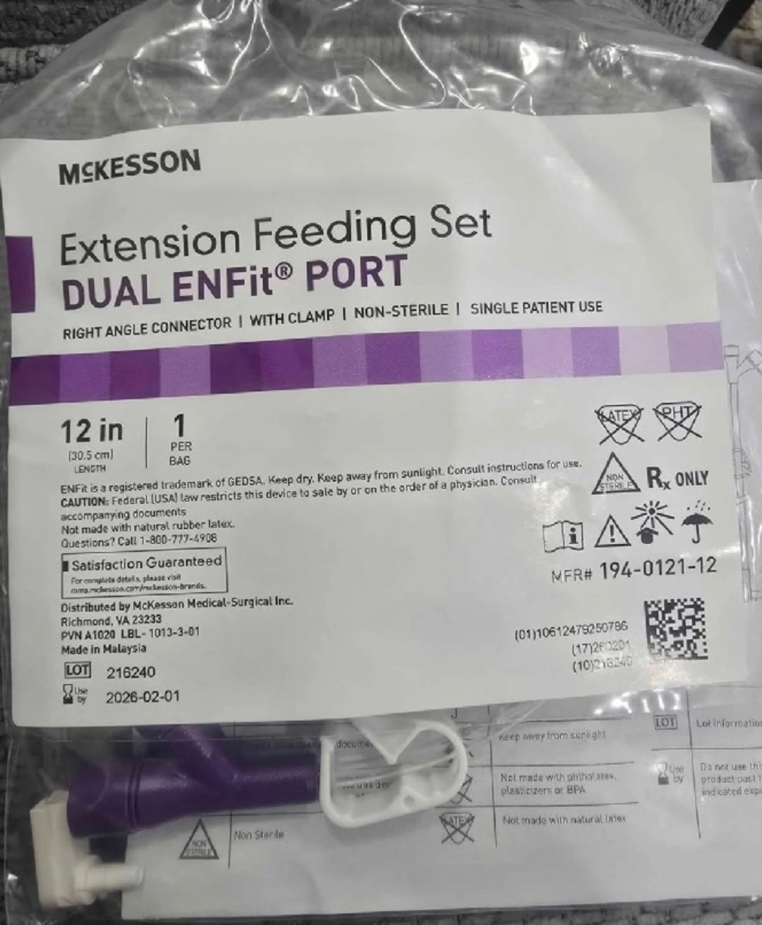 Selling a McKesson Extension Feeding Set with Dual ENFit Port. This set features a right-angle connector and clamp, and is designed for single-patient use. It measures 12 inches in length. The lot number is 216240. box of 5 $75