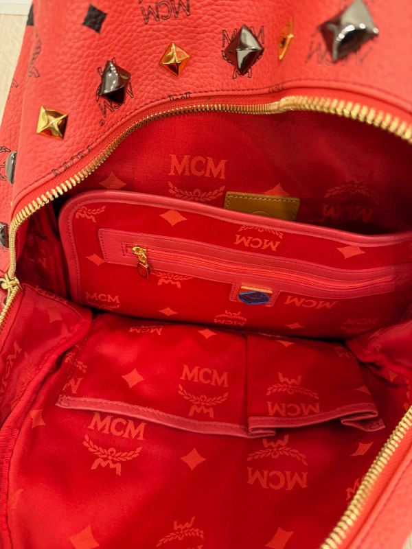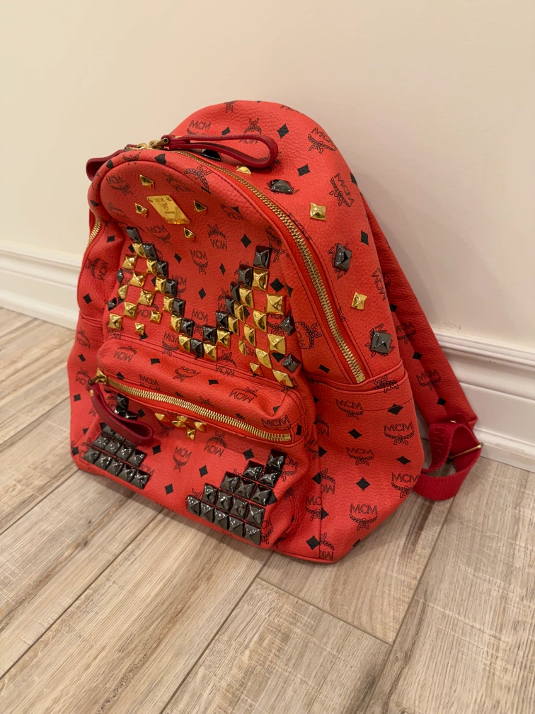 95Selling a stylish MCM Stark backpack in red. It features a unique studded design and the classic MCM logo pattern all over. The interior is spacious with multiple compartments to keep your belongings organized. Great for adding a pop of colour to your everyday look!