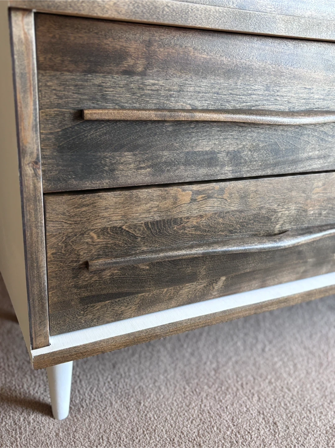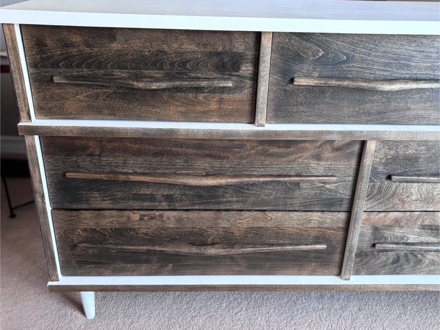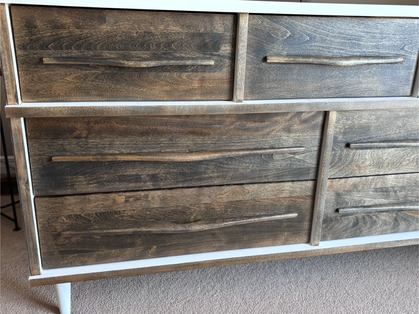 This dresser features a beautiful wood grain on the drawers and a clean white finish on the frame and legs. It's a stylish piece that would look great in any bedroom or living space. The drawers offer ample storage, and the design is both modern and timeless. Dimensions: 16.25” deep x 54.25” long x 30.75” high. Pick up in Hespeler.