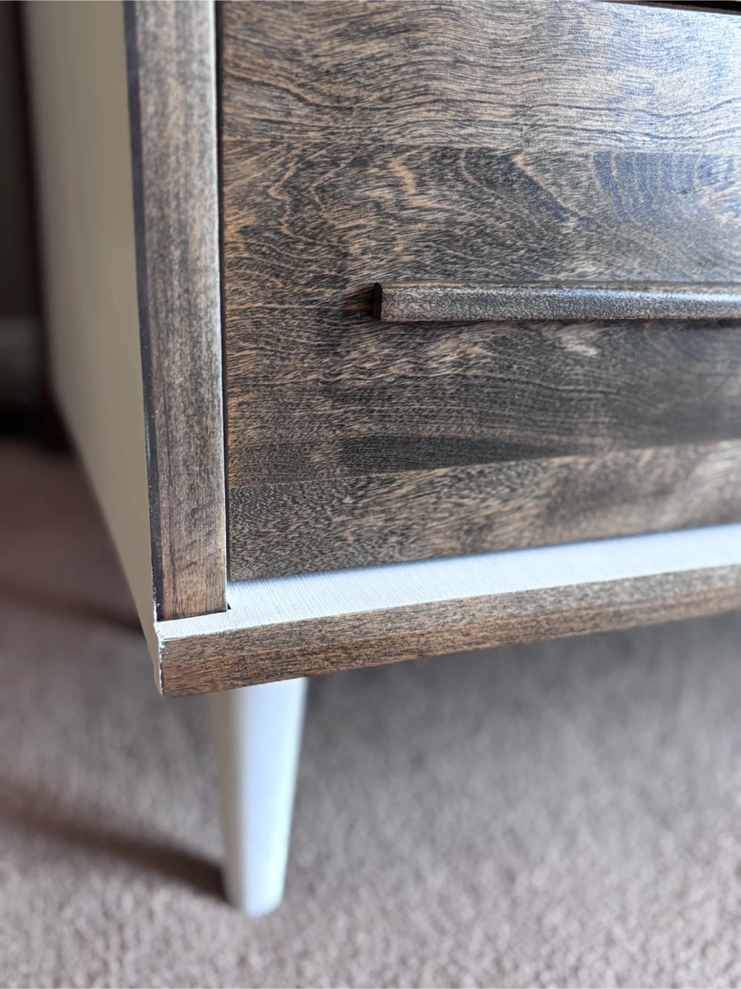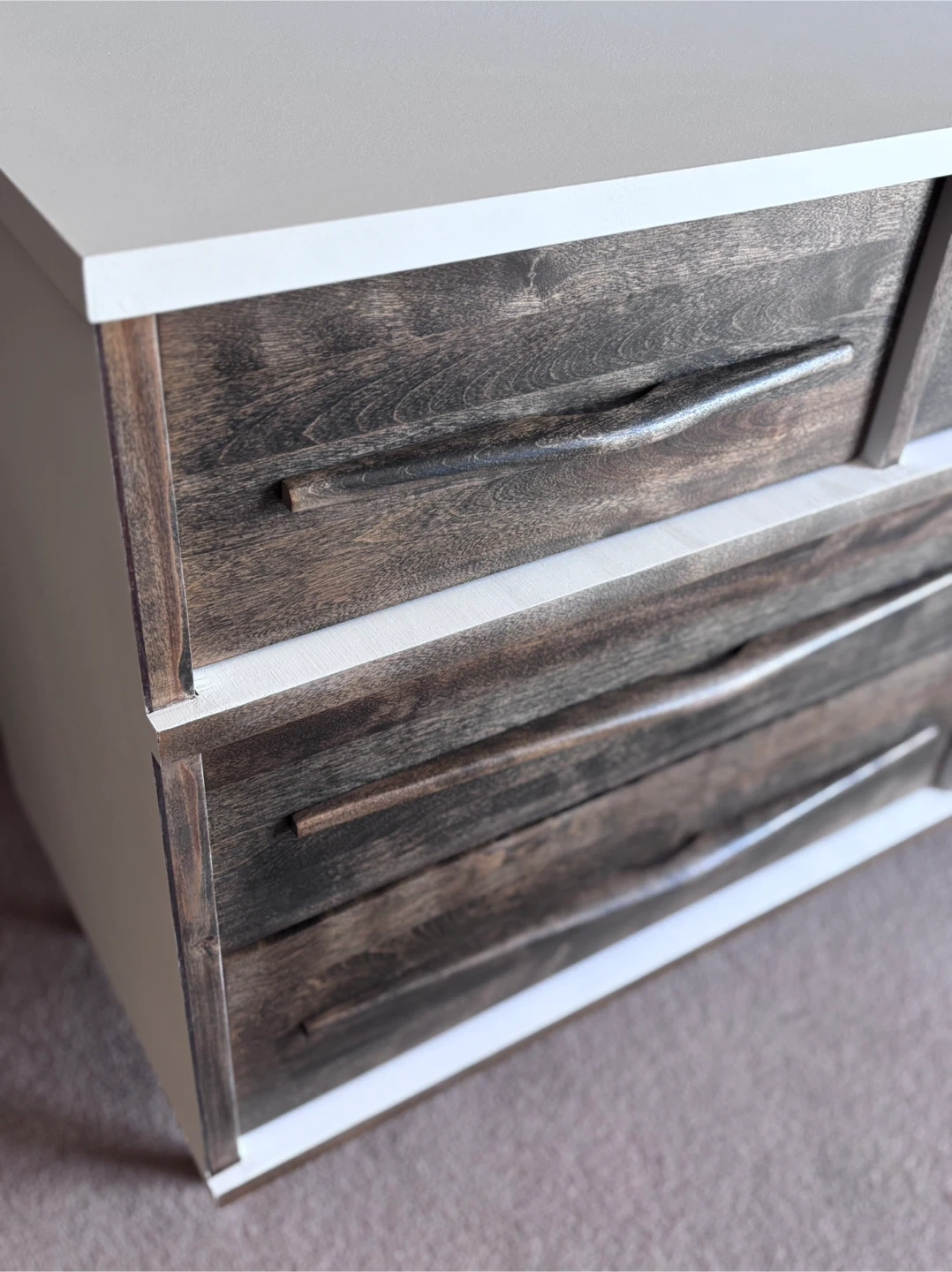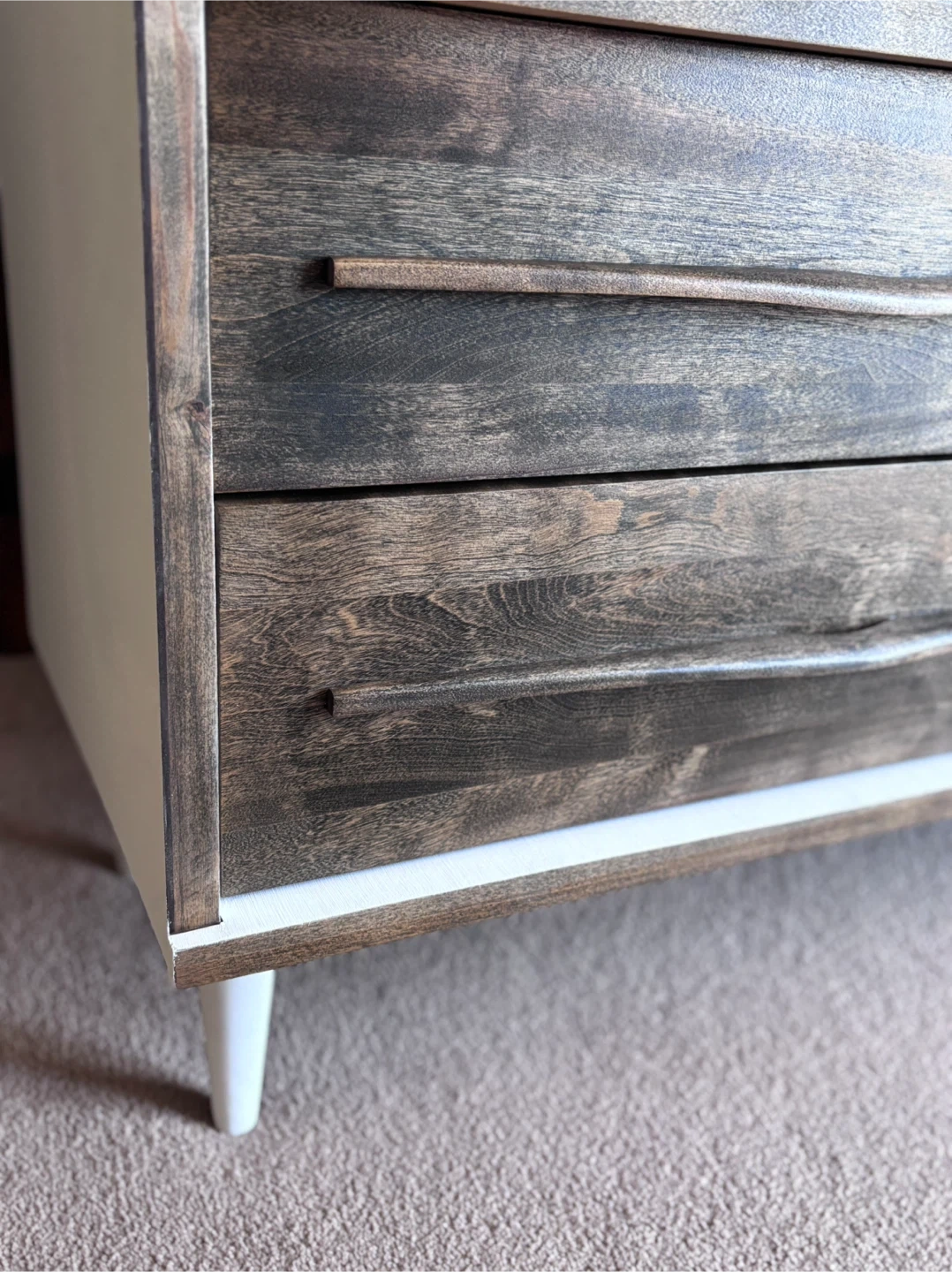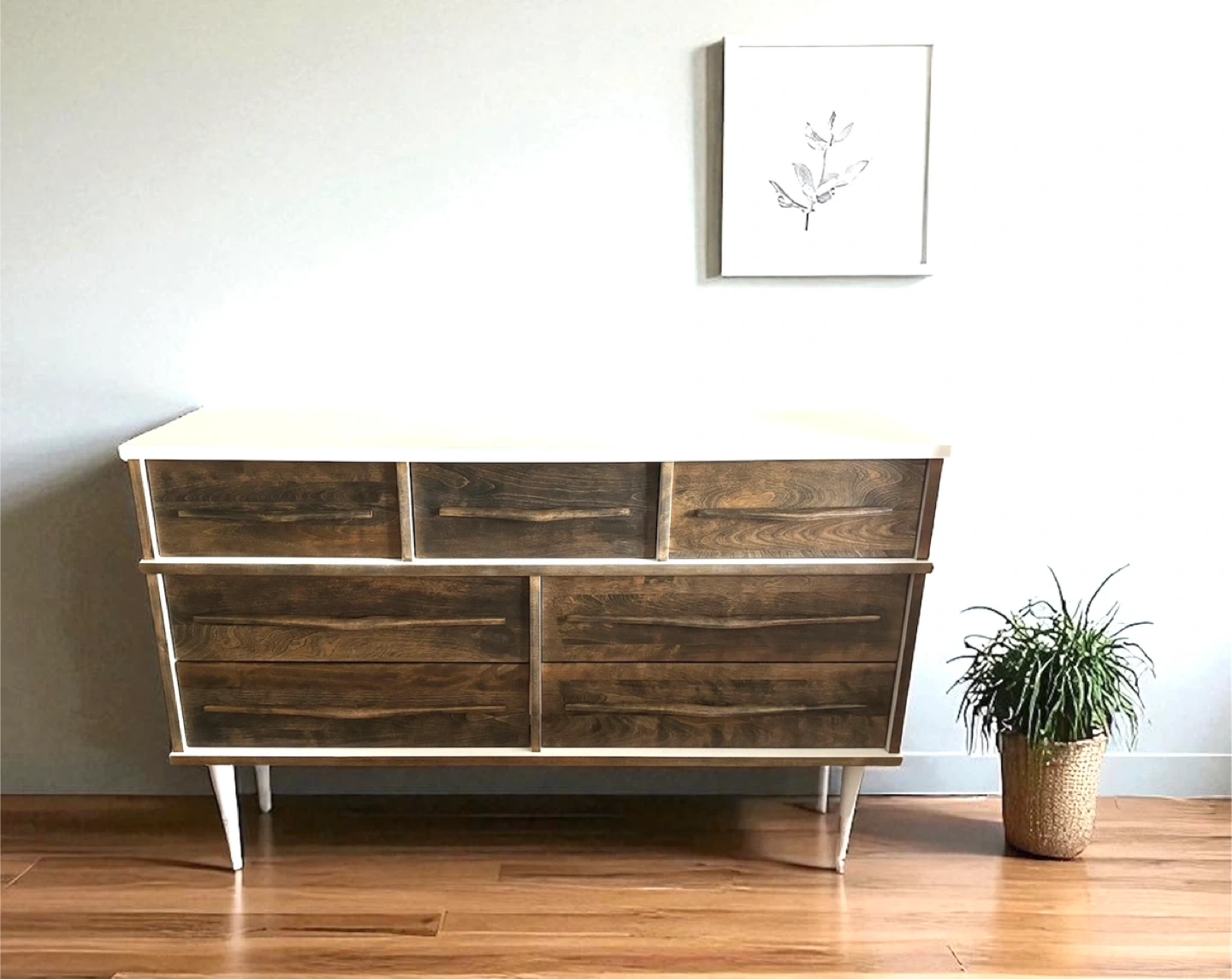 This dresser features a beautiful wood grain on the drawers and a clean white finish on the frame and legs. It's a stylish piece that would look great in any bedroom or living space. The drawers offer ample storage, and the design is both modern and timeless. Dimensions: 16.25” deep x 54.25” long x 30.75” high. Pick up in Hespeler.