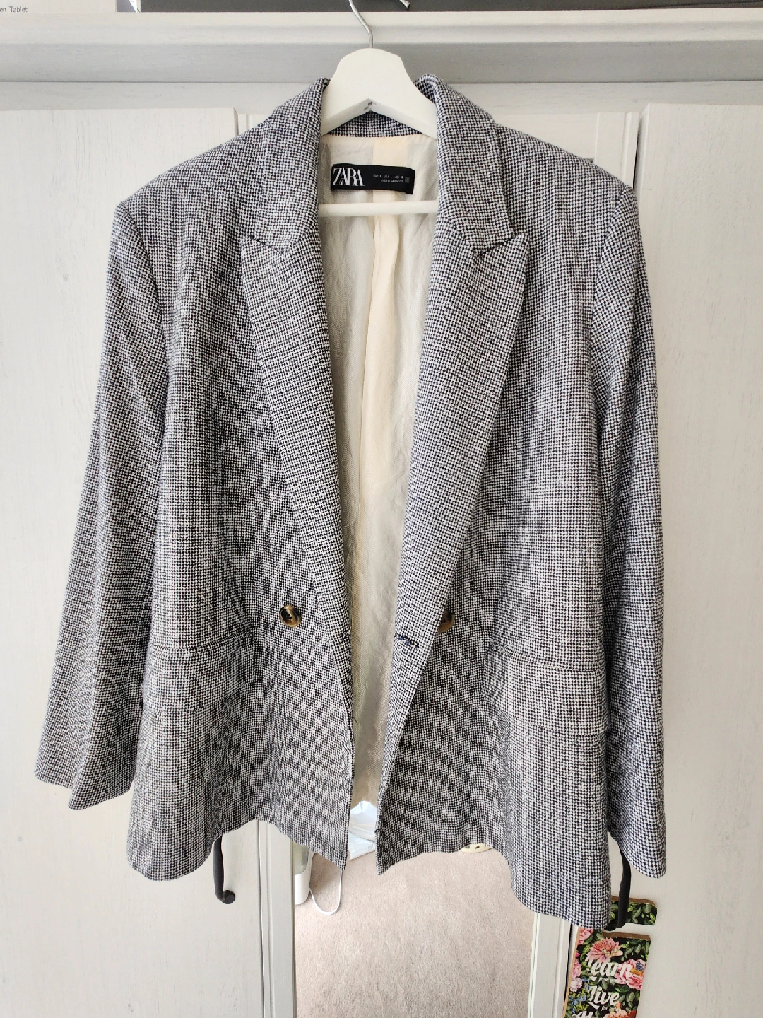 Selling a Zara blazer in a classic houndstooth pattern! This blazer features a double-breasted design. The material is comfortable and the blazer is in great condition!