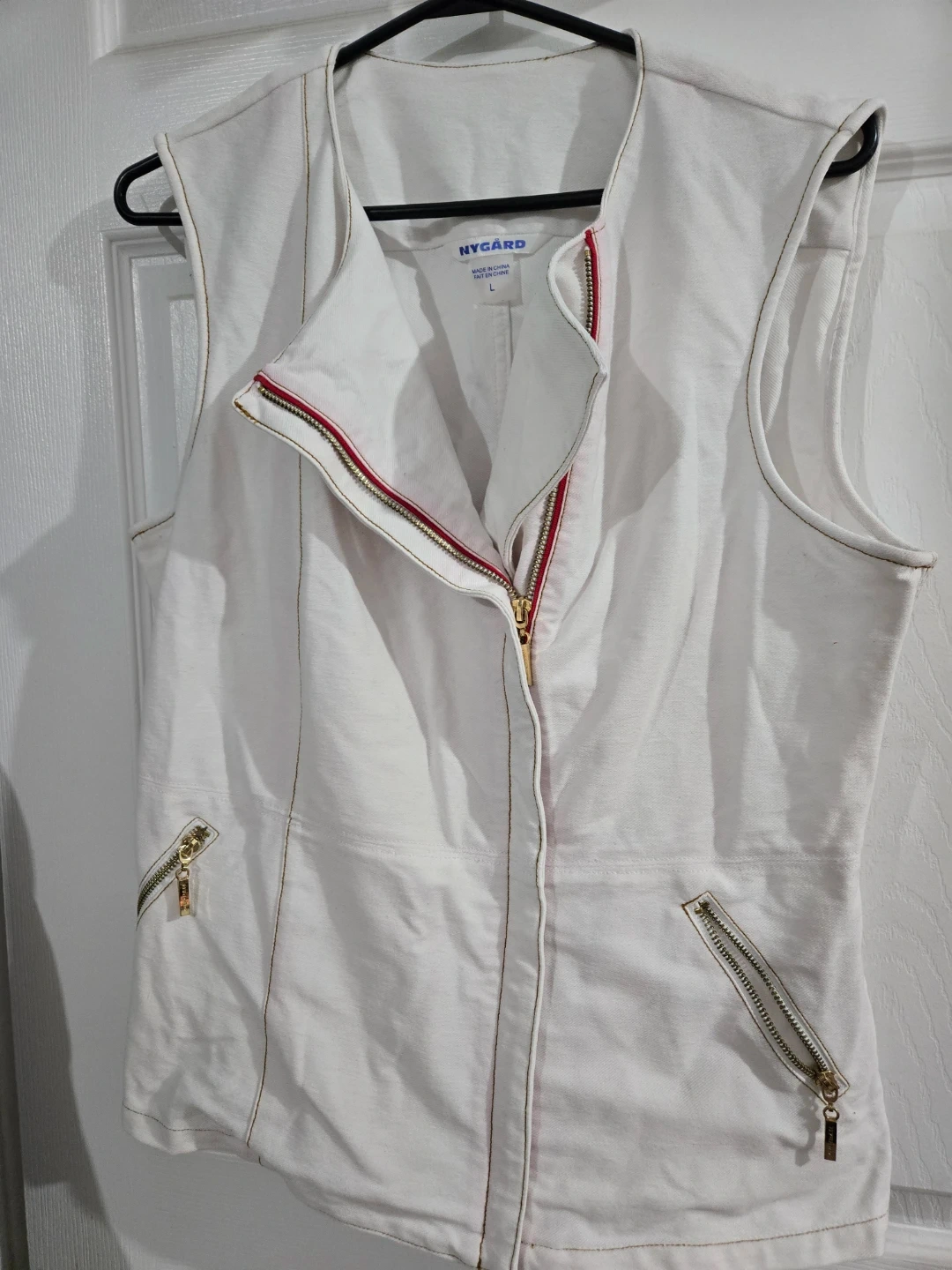 This Nygard vest is white with gold zippers and red trim. It's a size large. It features two zippered pockets on the front.