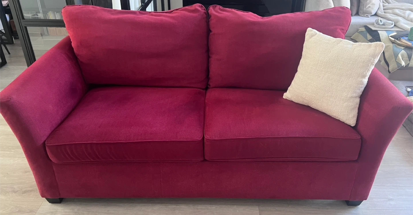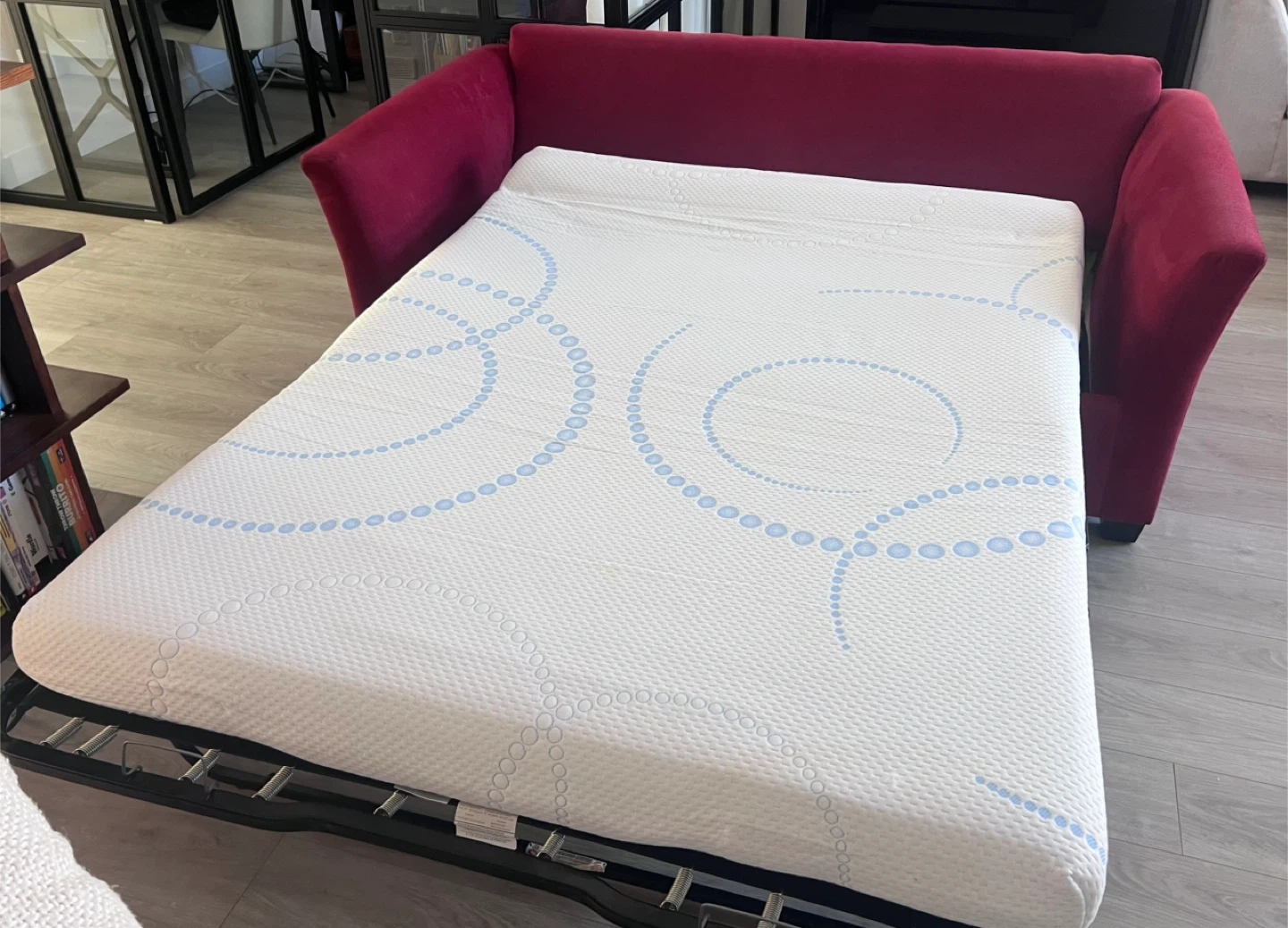 Love sofa that converts into a bed. Features a comfortable memory foam mattress. Perfect for small spaces or guest rooms!