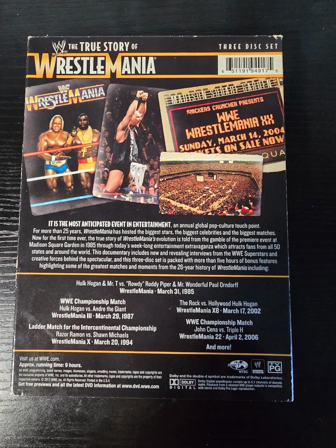 This is the 3-disc set for WWE's The True Story of WrestleMania. It chronicles the evolution of the event from its start. Includes many famous matches and behind-the-scenes features! Perfect for any wrestling fan.
